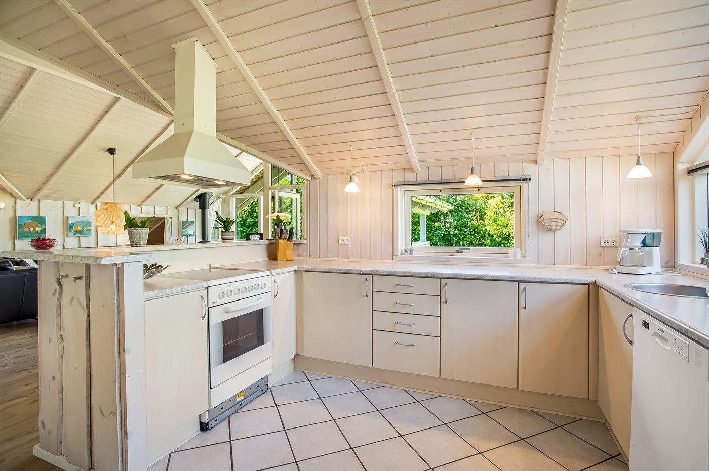 Køkkenet er udstyret med 1 køleskab. Der er 4 keramiske kogeplader, varmluftovn, mikrobølgeovn samt opvaskemaskine.