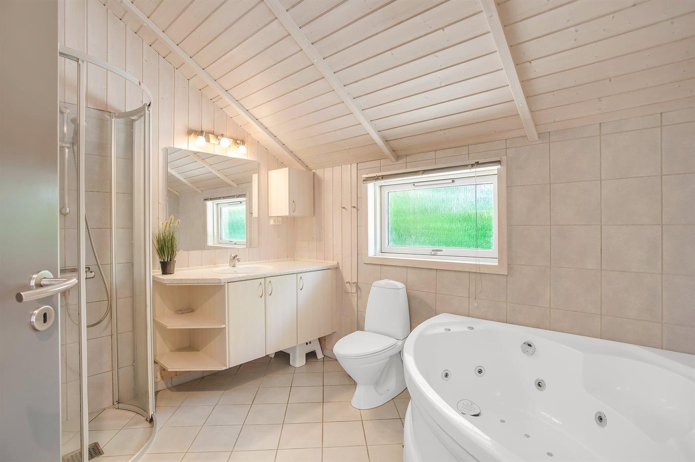 Der er 1 badeværelse med bruseniche og 2 toiletter, heraf 1 gæstetoilet. Der er gulvvarme på 1 badeværelse. Der er gulvvarme på gæstetoilettet. I saunaen er der mulighed for afslapning.