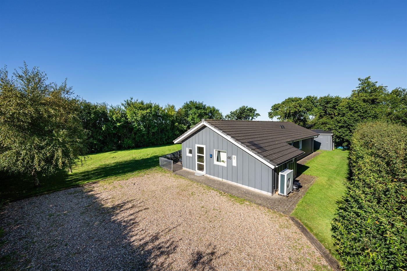 Ferieboligen er beliggende på en 1200 m² stor havegrund. Der er 7000 m til havet. Der er 1200 m til fjorden. Nærmeste forretning er beliggende i en afstand af 1500 m. Til ferieboligen hører 70 m² terrasseareal. Desuden er der 15 m² overdækket terrasse. Der er redskabsrum. Gynge. Der er installeret stik til opladning af elbil. Type 2 stik. Med 11 kW ladeeffekt. Parkering ved ferieboligen.