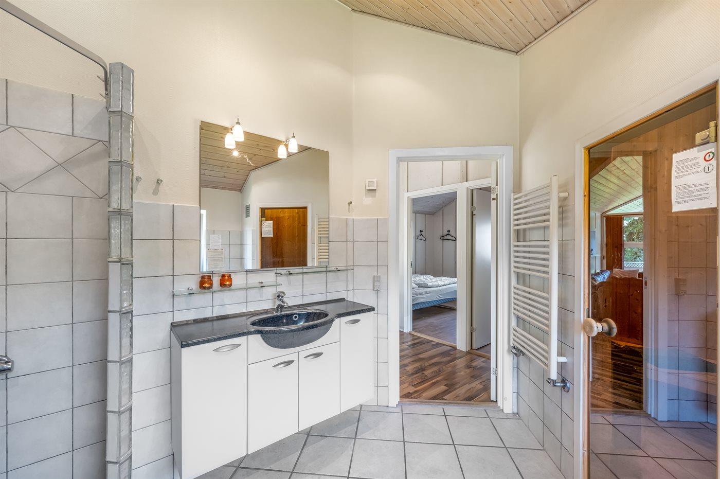 Der er 2 badeværelser med bruseniche og 2 toiletter. Der er gulvvarme på 1 badeværelse. I saunaen er der mulighed for afslapning.
