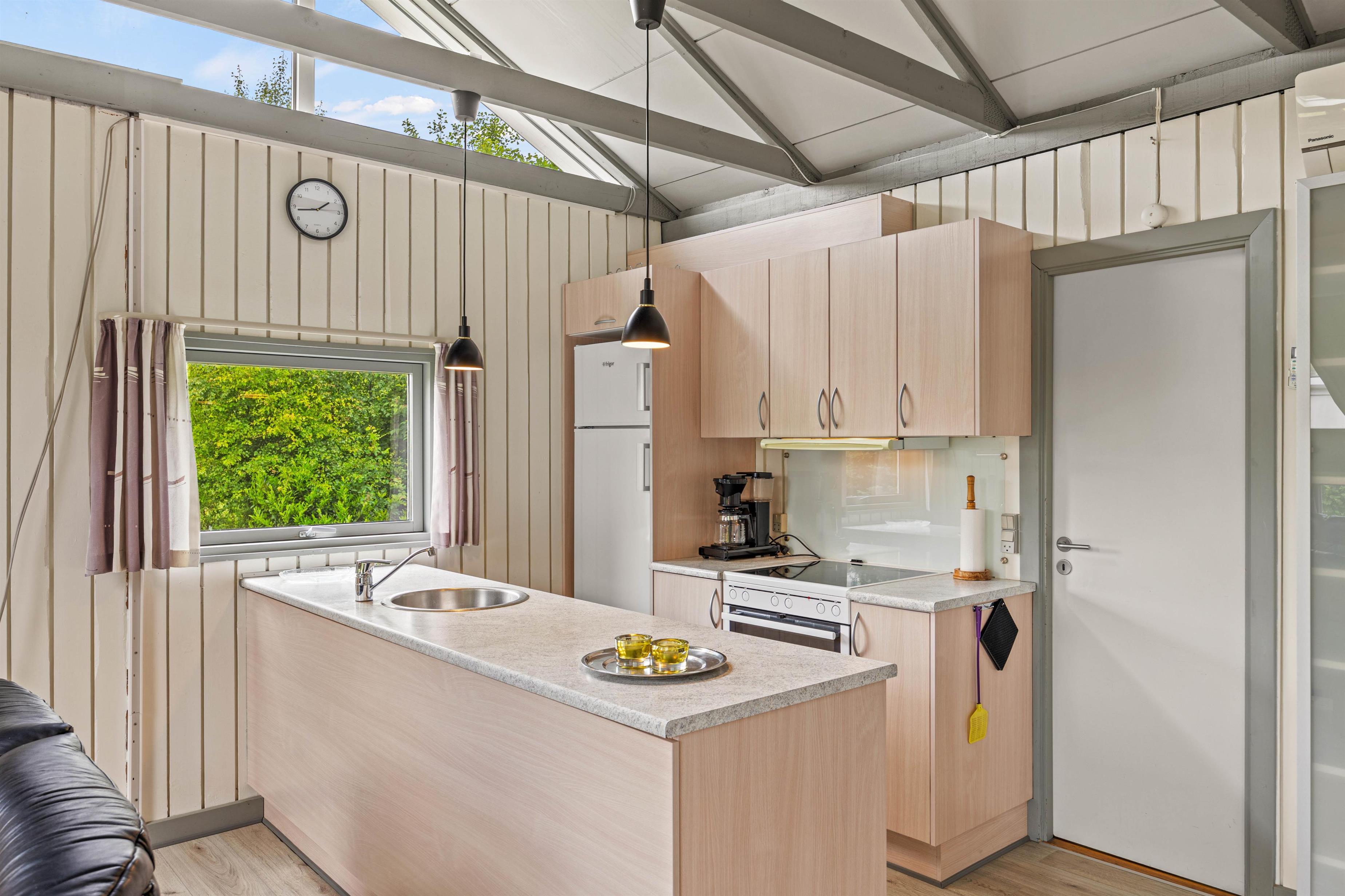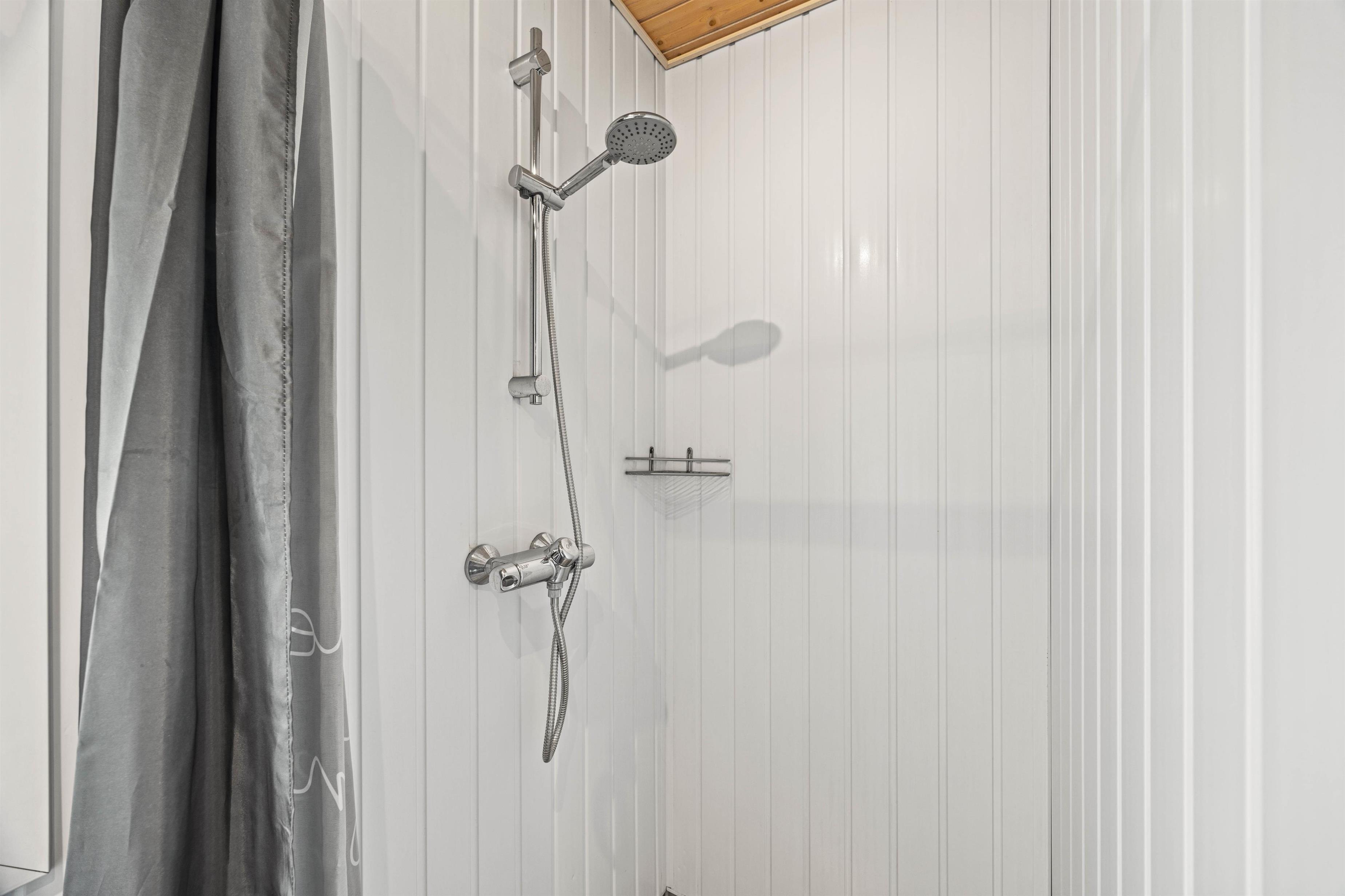 Hjertet af sommerhuset er helt klart det hyggelige opholdsrum, hvor en indbydende brændeovn spreder varme og skaber en hyggelig atmosfære. Her kan I samles for at nyde en god film eller blot slappe af med nærværende samtaler. Når sulten melder sig, er der ingen grund til panik over oprydningen, da opvaskemaskinen står klar til at hjælpe. Derudover er der 1 badeværelse i somemrhuset med gulvvarme.