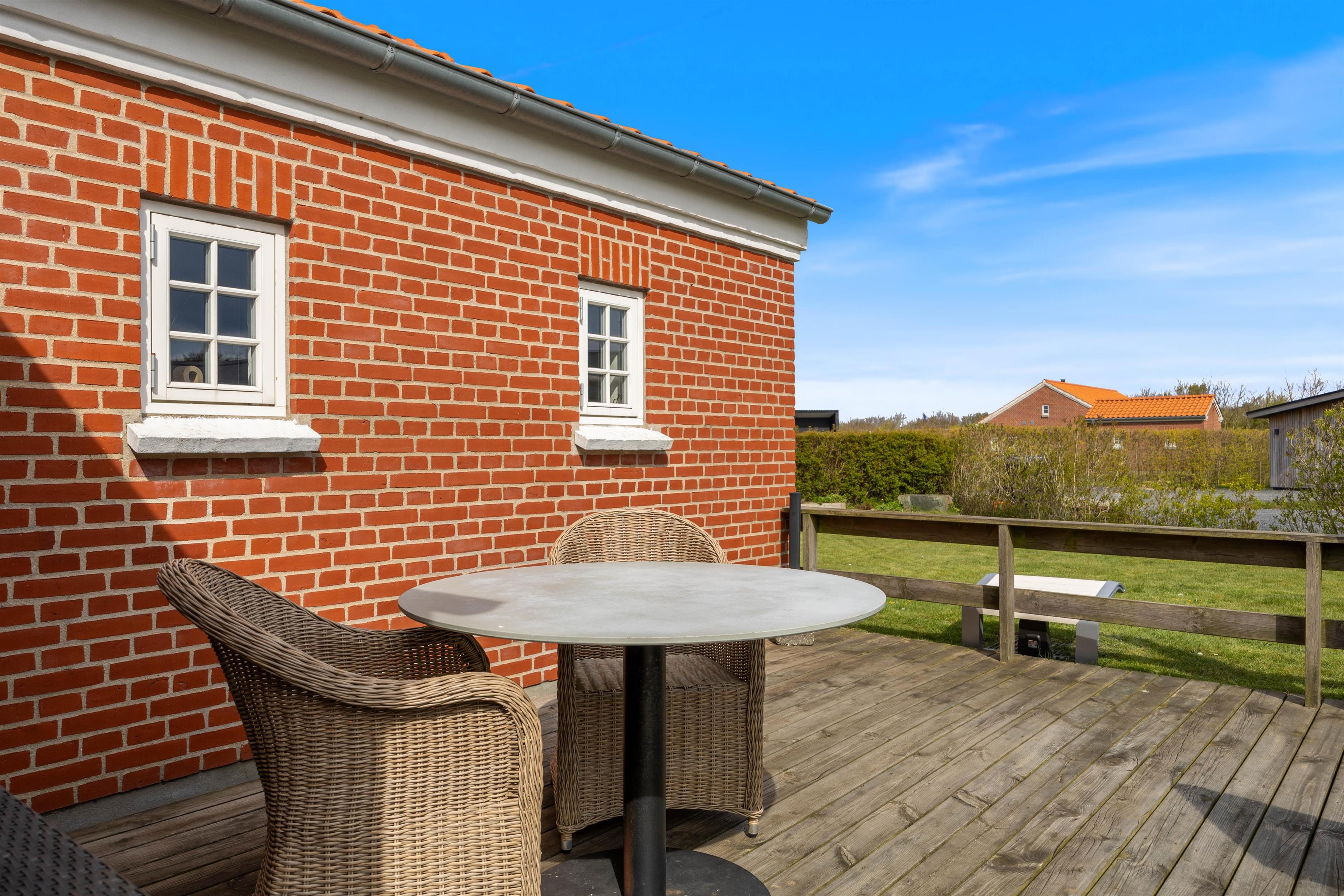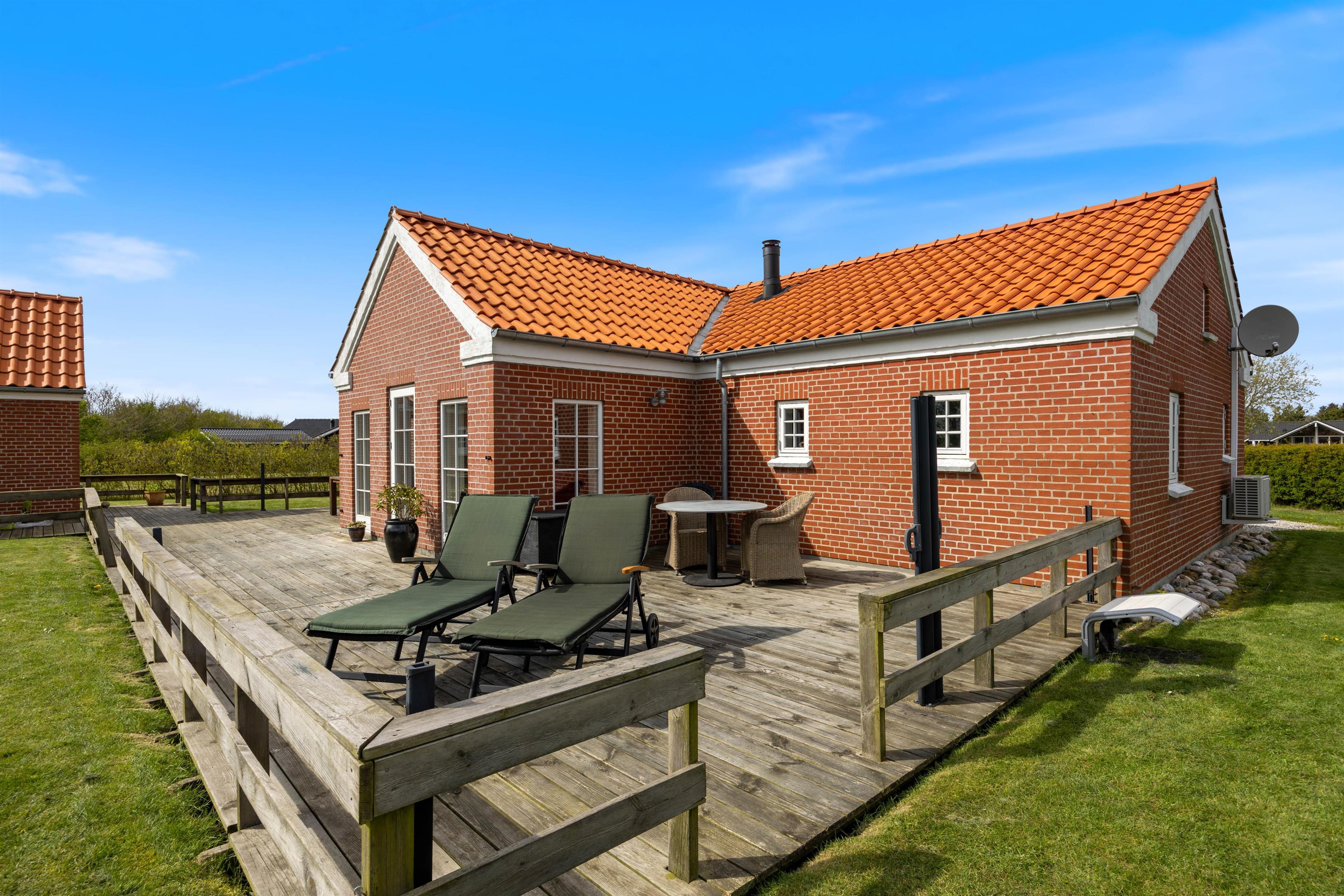 Feriehuset er beliggende på en 1278 kvadratmeter stor plænegrund, som giver masser af plads til boldspil og andre udendørsaktiviteter. Fra den store, åbne træterrasse kan I holde øje med børnene, mens I selv slapper af på solvognen eller tilbereder lækre måltider på grillen.