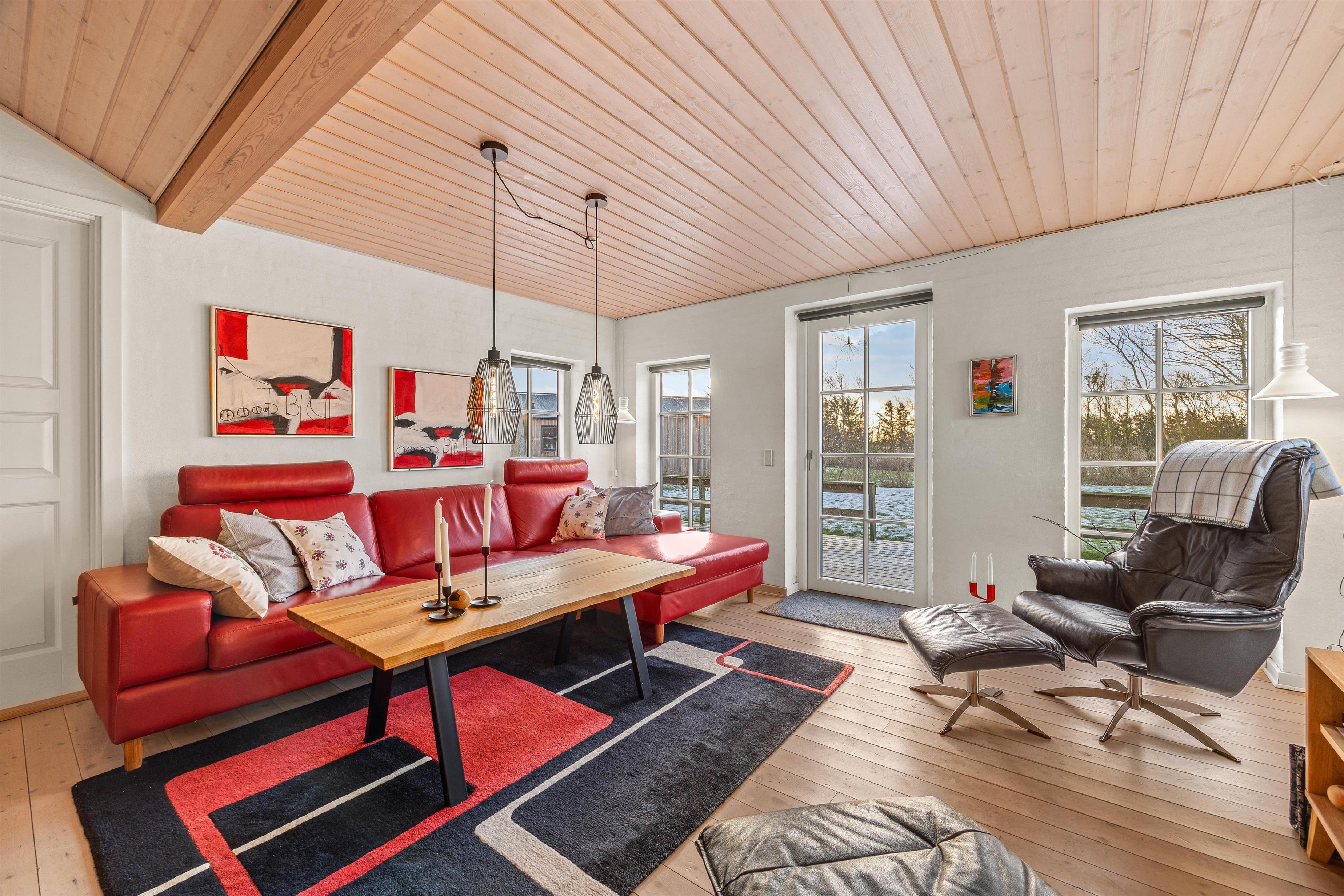Sommerhusets stue, køkken og spisestue ligger i åben forbindelse, så I kan nyde godt af hinandens nærvær, selvom I hver især hygger jer med forskellige ting.