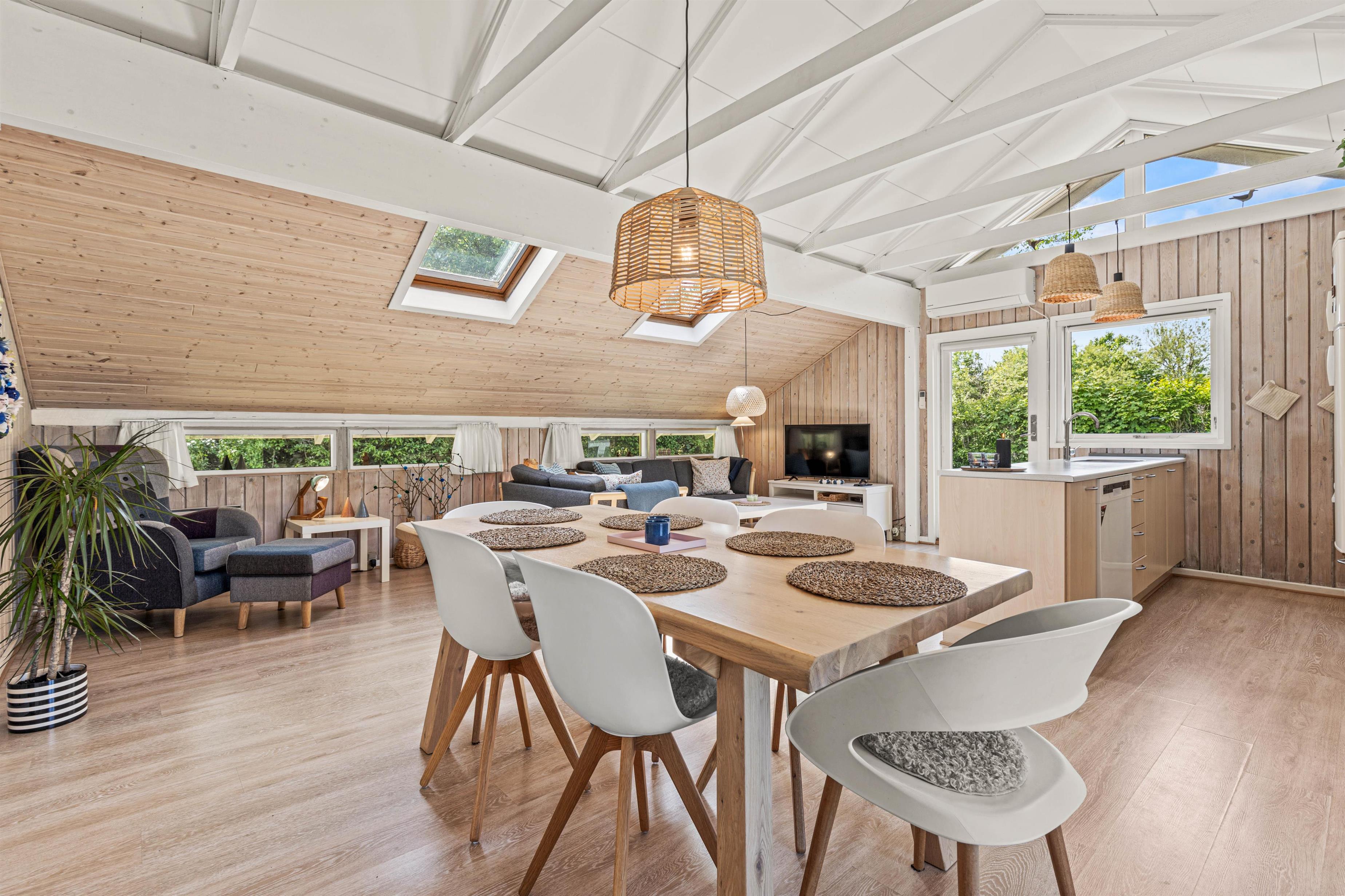Bliv mødt af en varm og hyggelig atmosfære. Et klassisk sommerhus til 5 feriegæster med træpaneler og en knitrende brændeovn i feriehusets hjerte; køkkenalrummet.