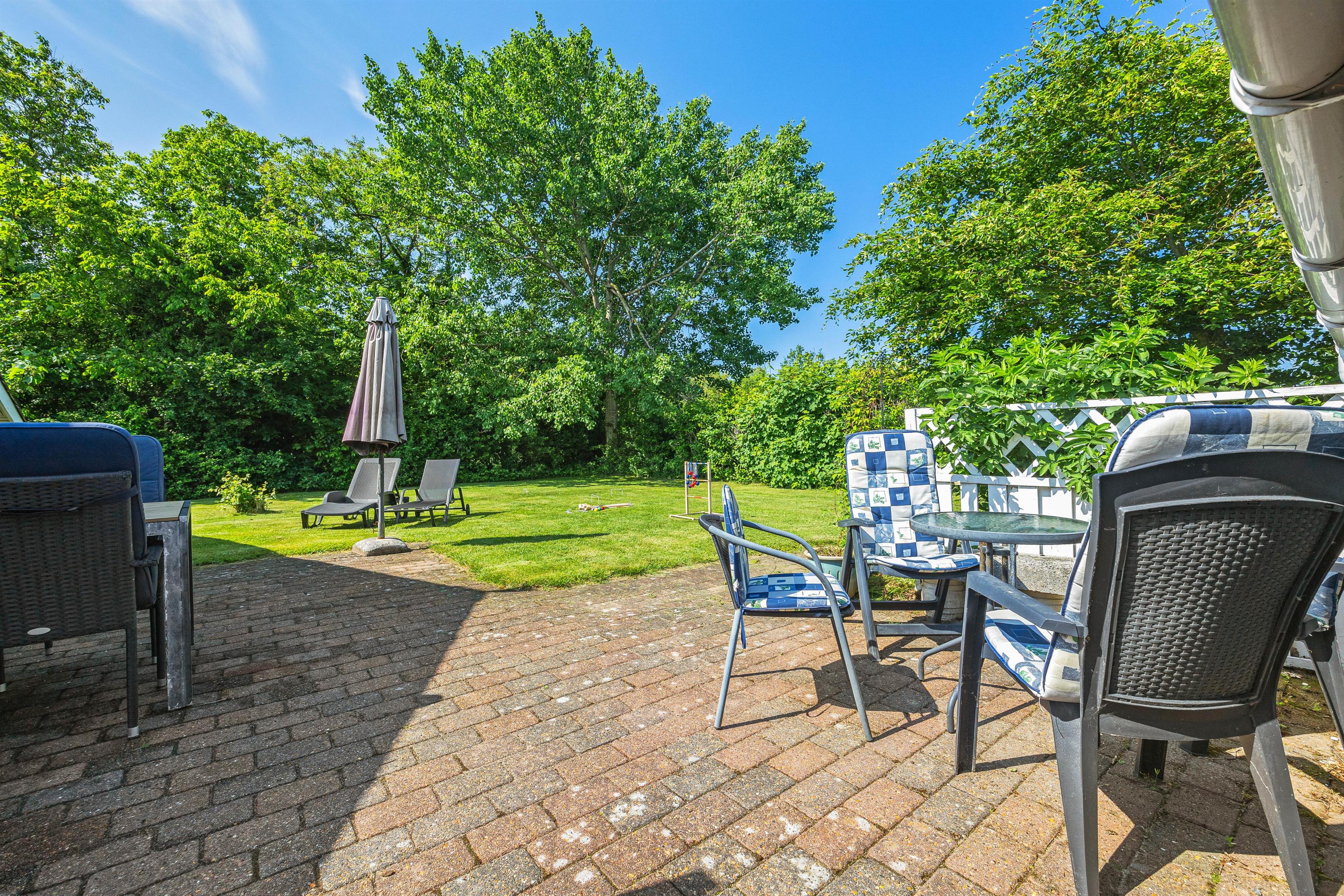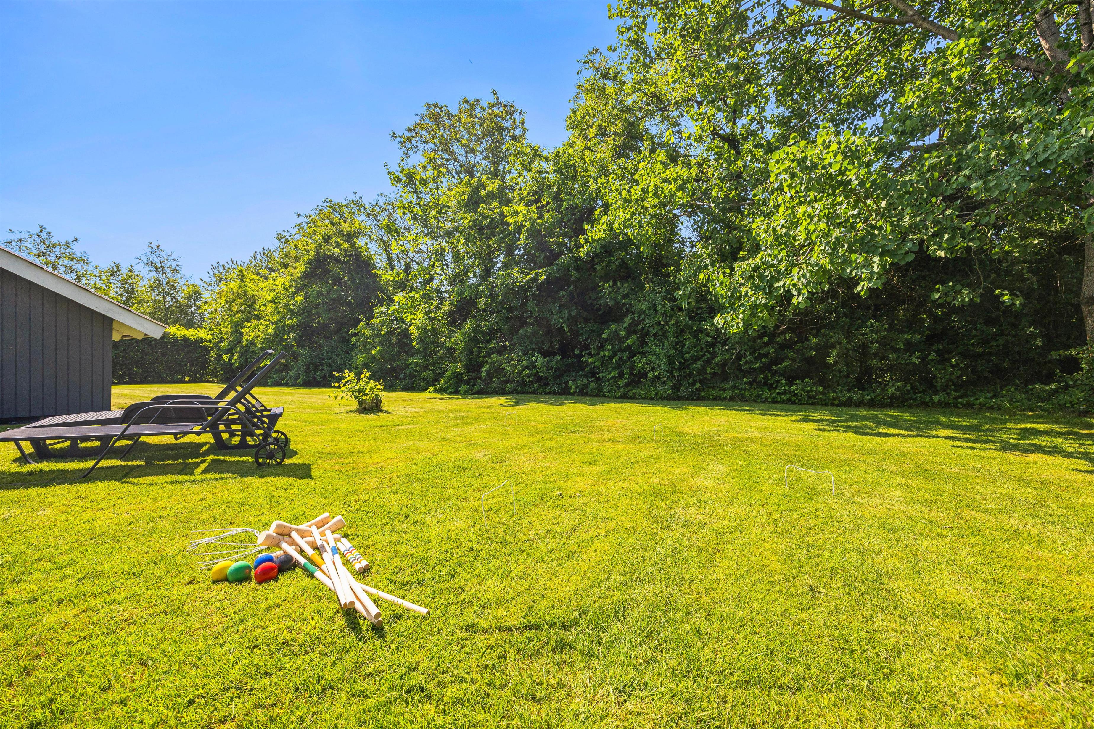 Lad børnene løbe rundt frit og spil kongespil på den grønne plæne – mulighederne er mange. Den velplejede have er omgivet af naturskønne omgivelser, der både giver privatliv og indbyder til udendørs aktiviteter, hvilket gør det til en ideel oase for både afslapning og familiehygge.