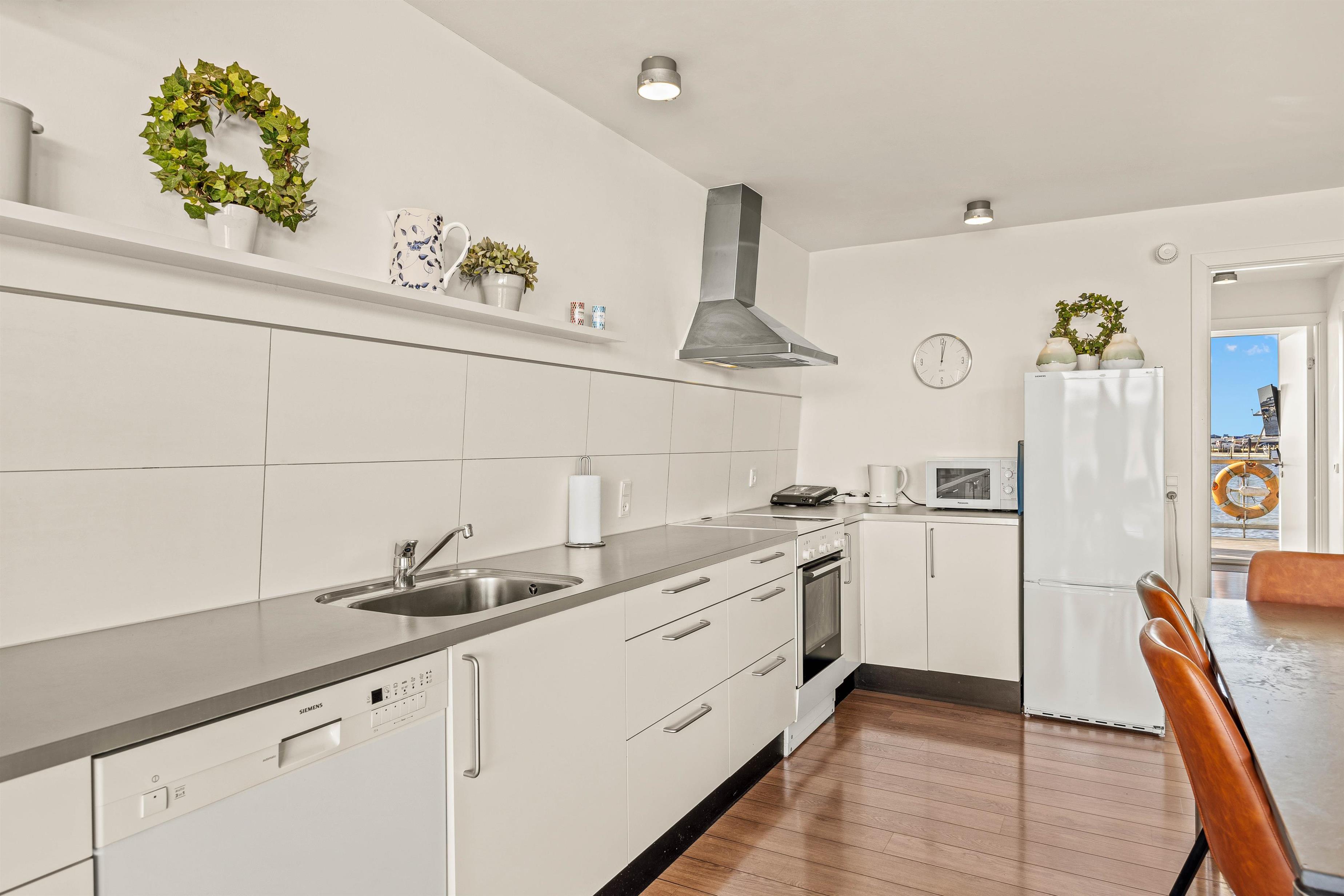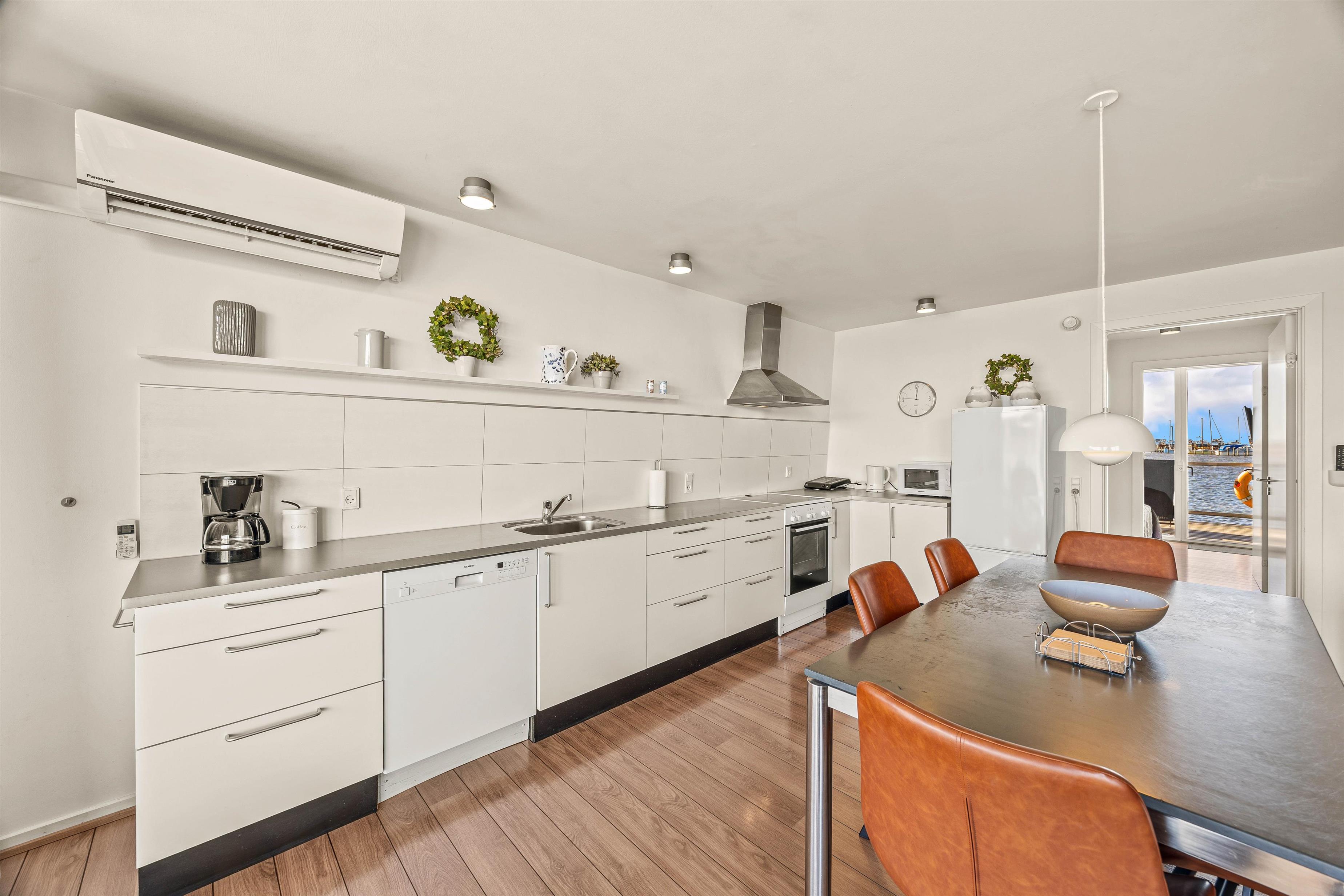 Når I træder ind i husbåden, bliver I mødt af et køkkenalrum, der virkelig indbyder til samvær og hygge. Her kan I, i fællesskab tilberede et måltid og måske nyde lokale nyfangster i de skønne omgivelser.