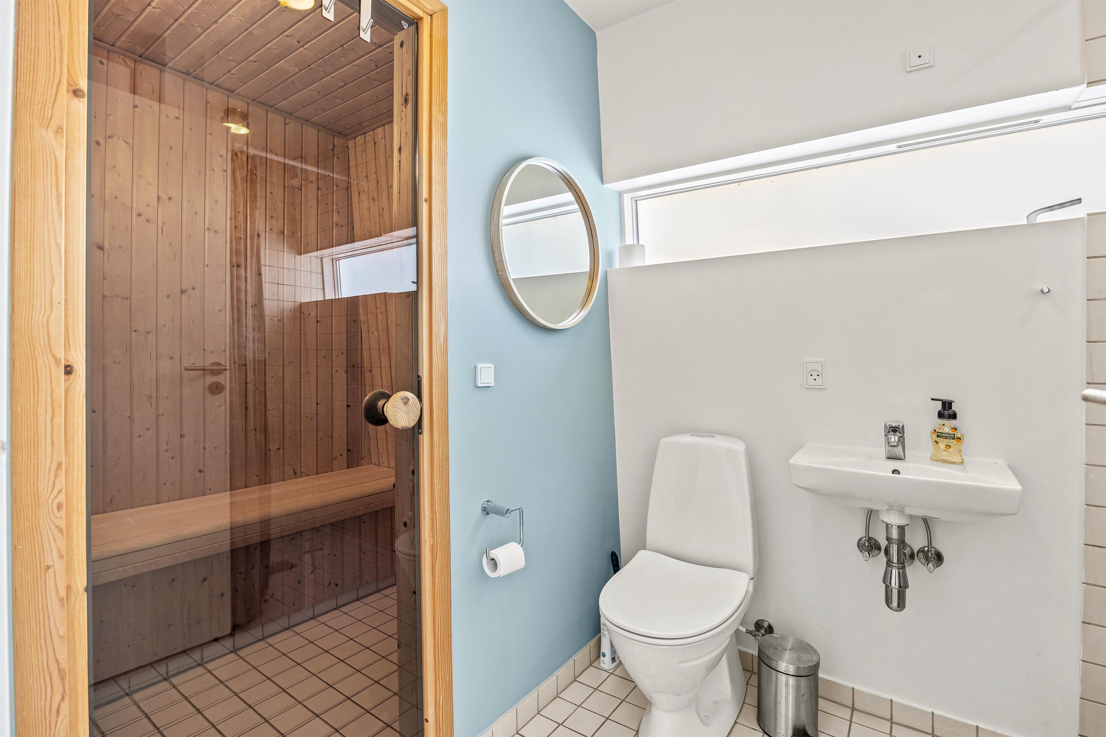 På stueetagen finder I også badeværelset, hvor I kan benytte både vaskemaskine og sauna, perfekt til afspænding efter dagens aktiviteter. Her finder I også et soveværelse med dobbeltseng, der sikrer en god nattesøvn.