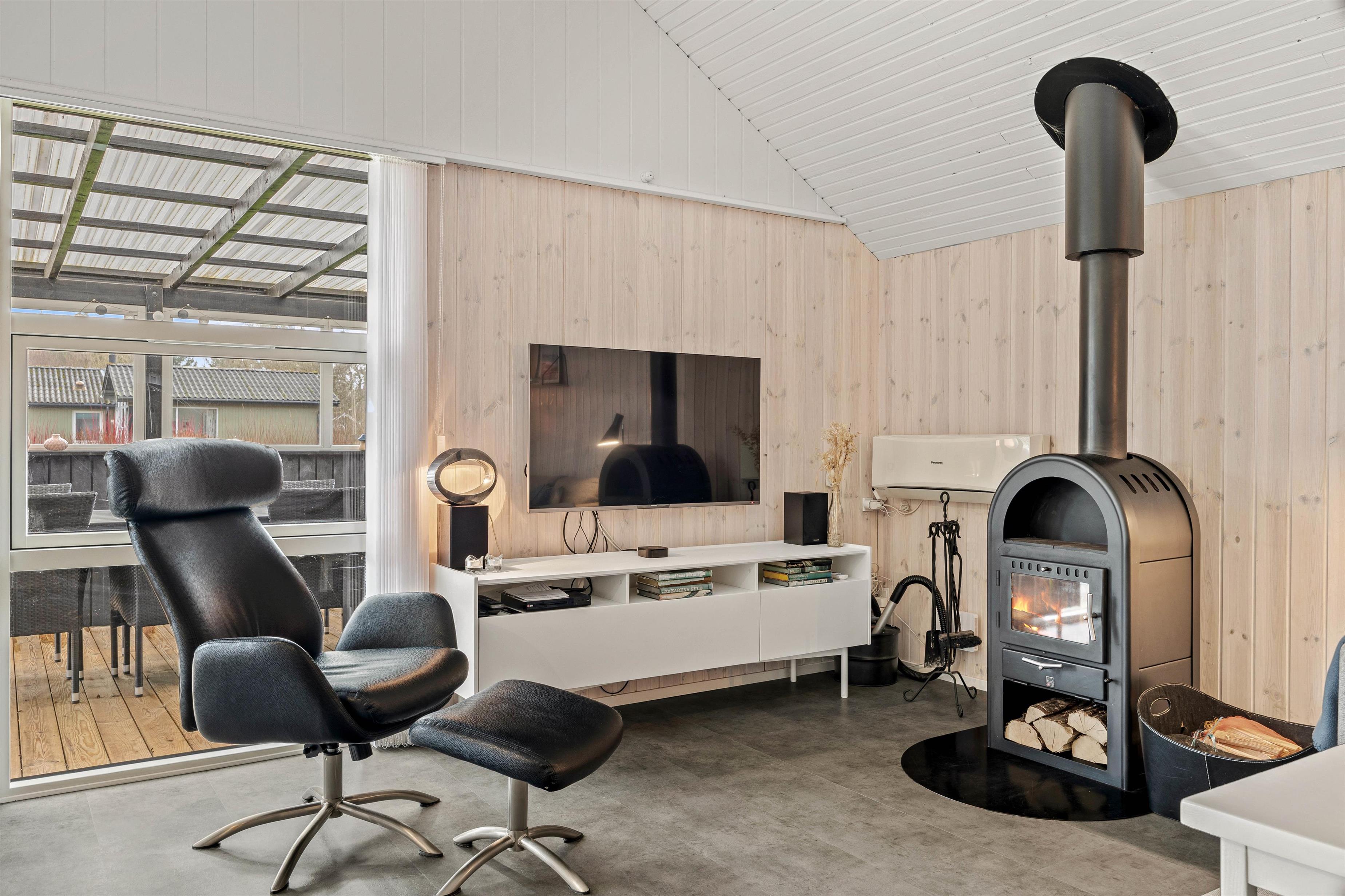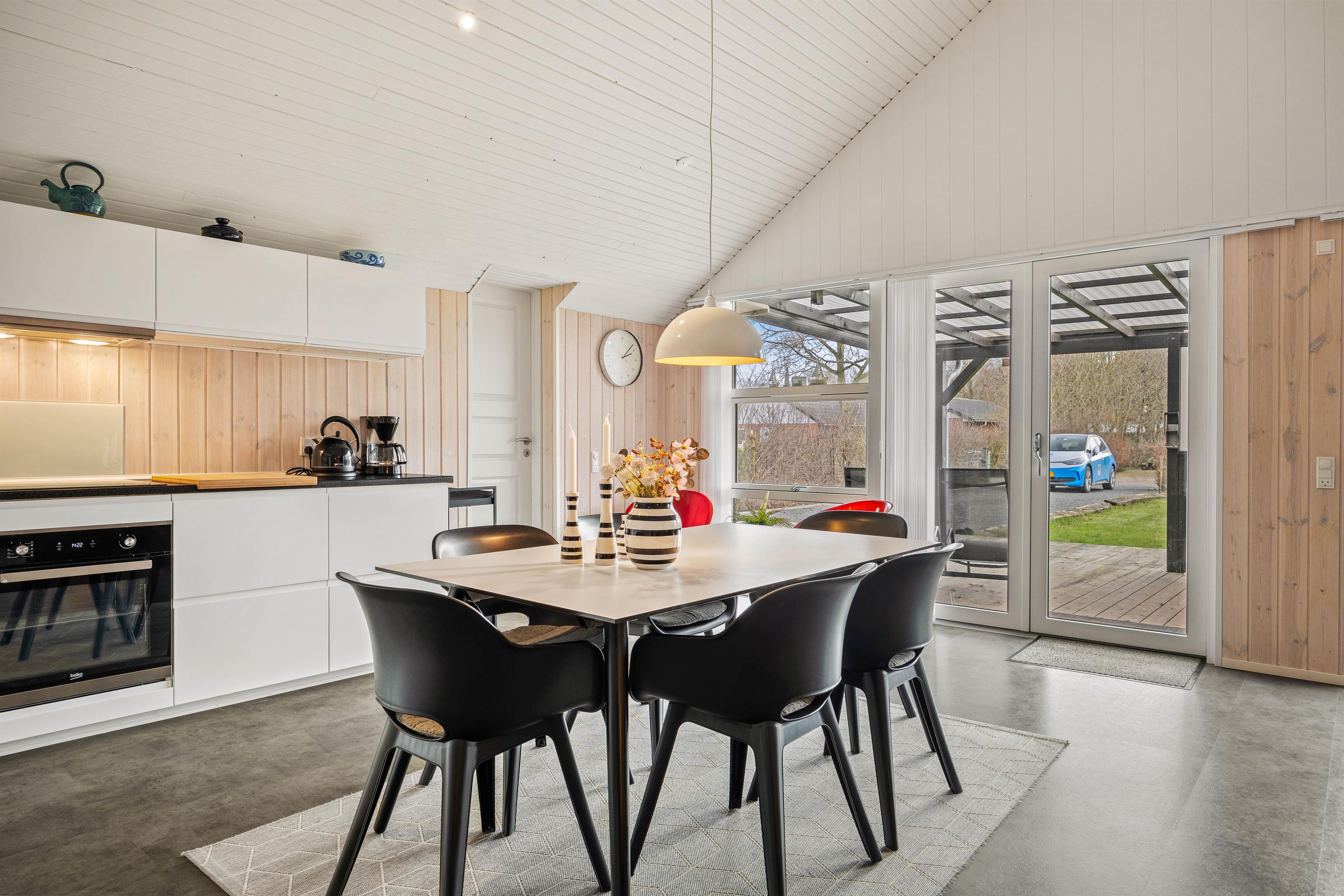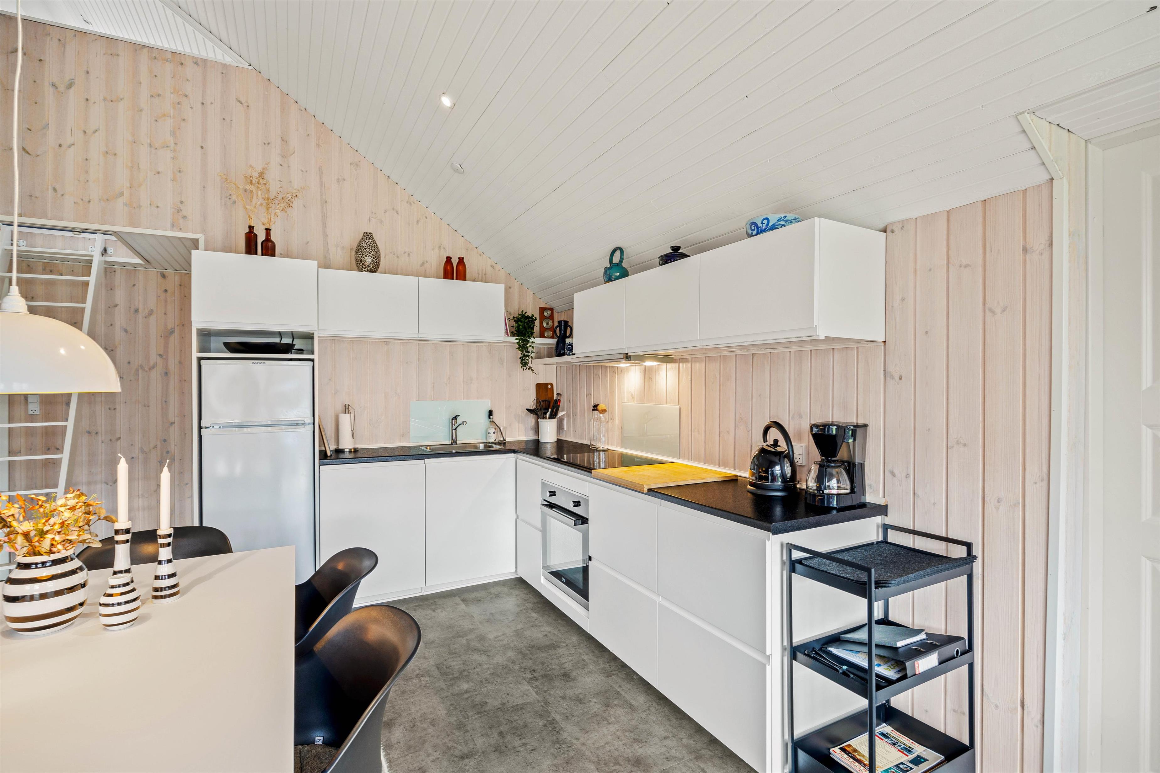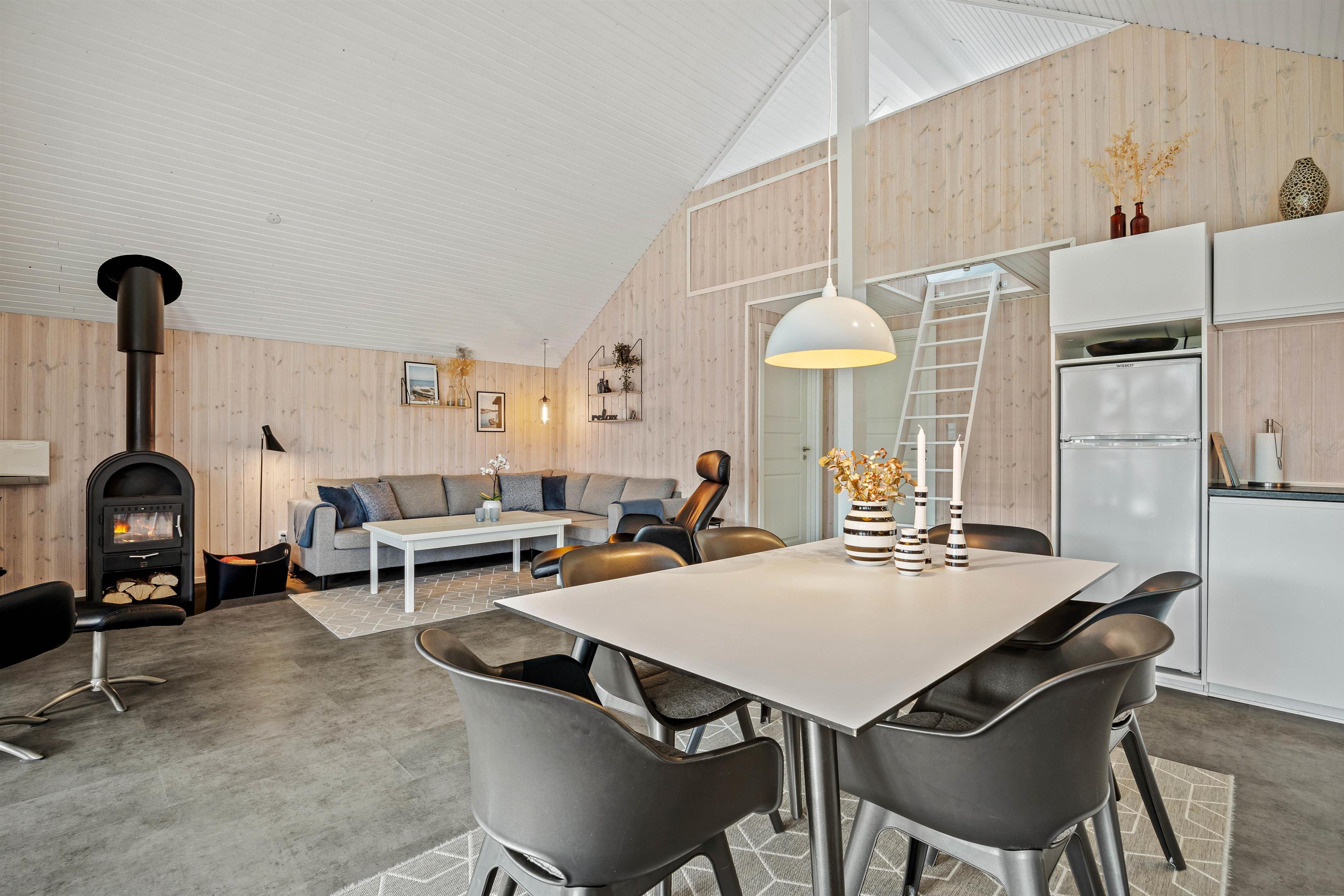 Det åbne køkken/alrum og opholdsstue bliver det naturlige samlingspunkt for jer på ferien. Herfra er udgang til terrassen, så I kan færdes frit ud og ind i løbet af dagen. Den lyse indretning byder jer velkommen straks, I træder ind ad døren. Her kan I slappe af i sofaen og nyde ildens knitren i brændeovnen, eller I kan spille et brætspil ved spisebordet. Det åbne køkken indeholder alt, hvad I behøver for at tilberede lækre hjemmelavede måltider til hinanden, herunder induktionskomfur og opvaskemaskine.