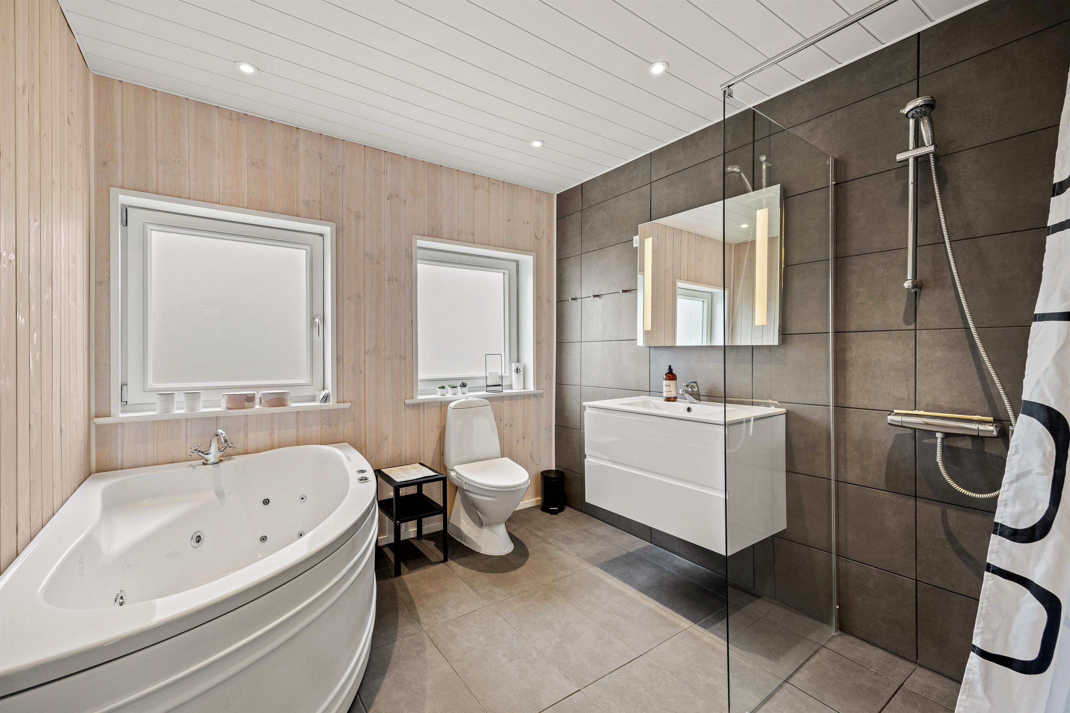 I badeværelset med gulvvarme er et spabad, hvor I kan arrangere en lille wellnessaften, når I føler for det.