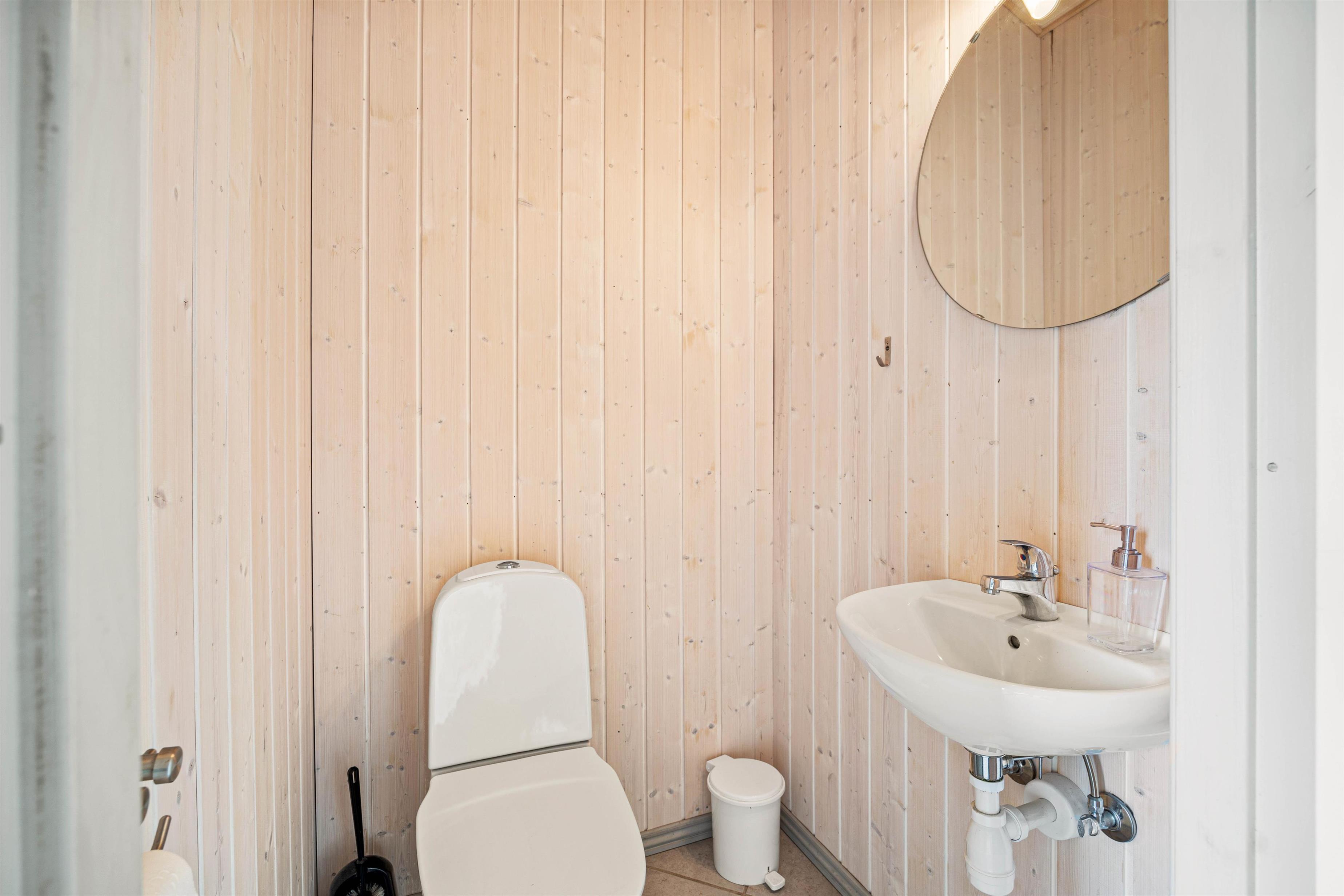 Sommerhusets badeværelse indbyder til ro og afslapning med både sauna og tømmespa, der tilbyder en perfekt måde at slappe af på efter en aktiv dag. Derudover er der også et gæstetoilet. Med både vaskemaskine og tørretumbler til rådighed er alt tænkt på for at sikre en komfortabel og ubekymret ferieoplevelse.