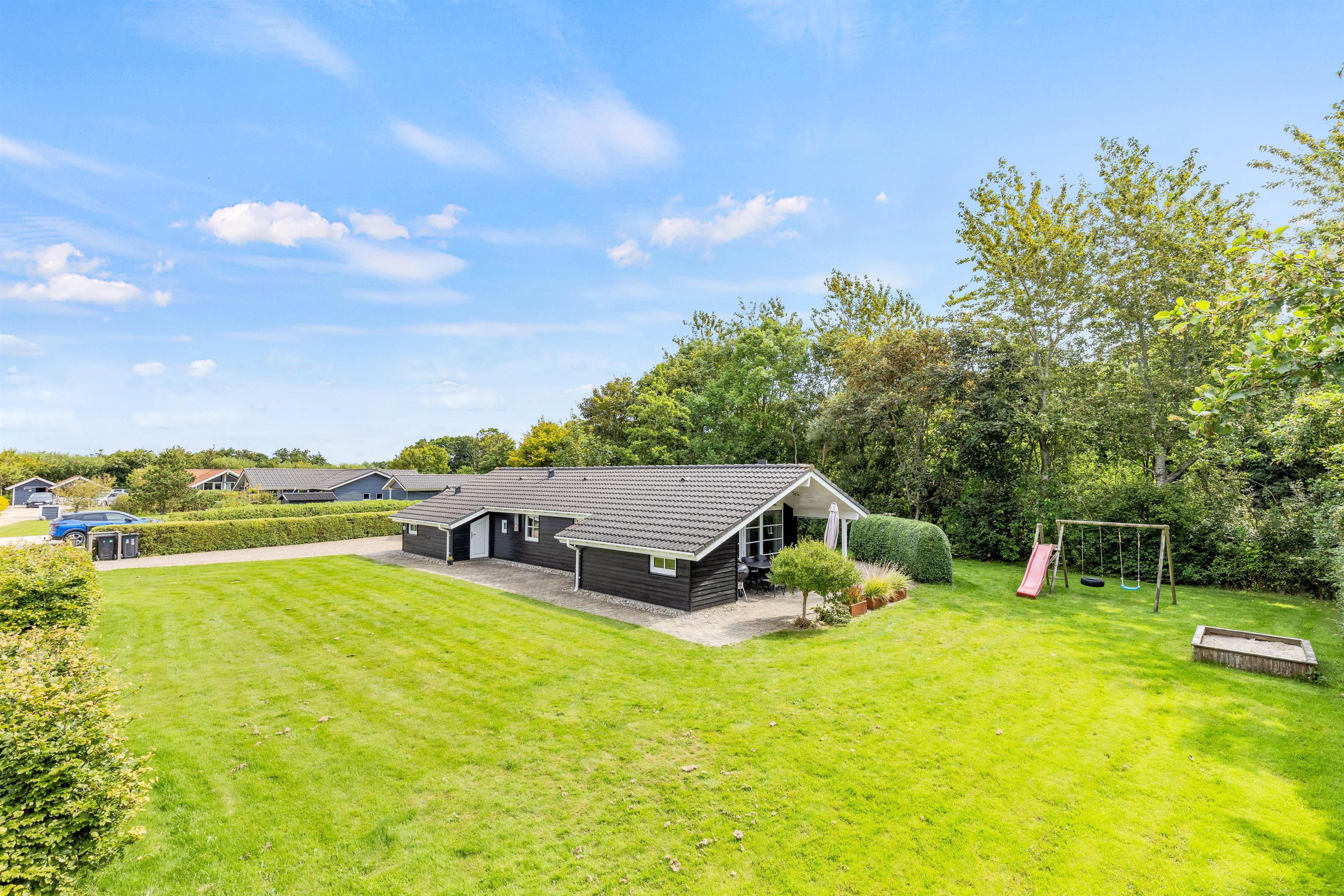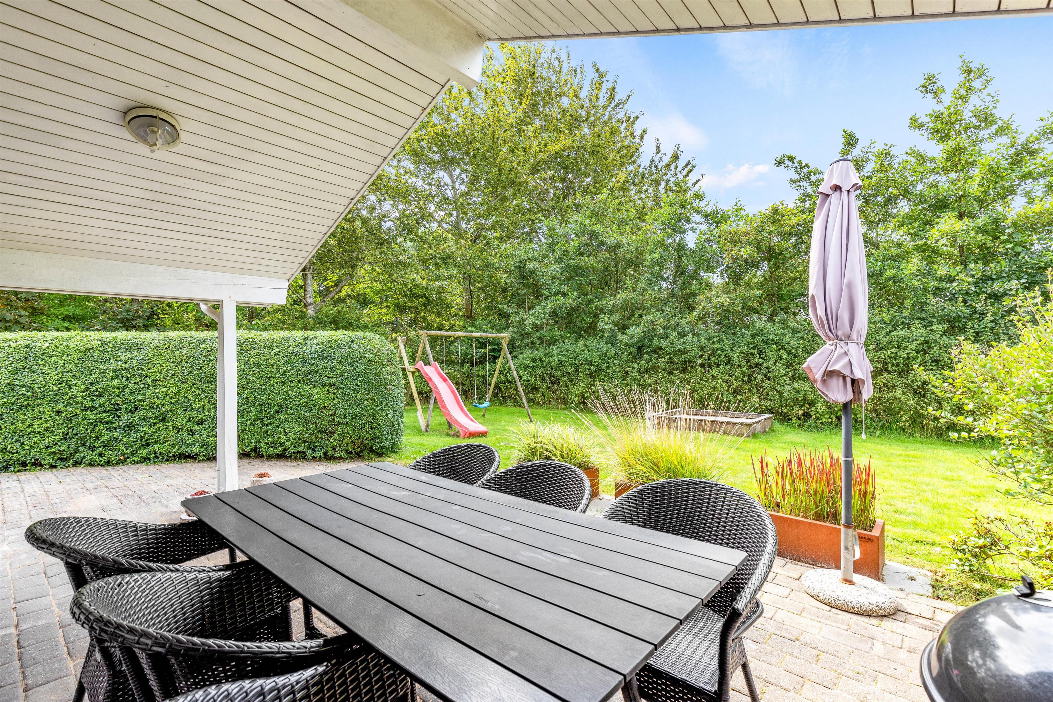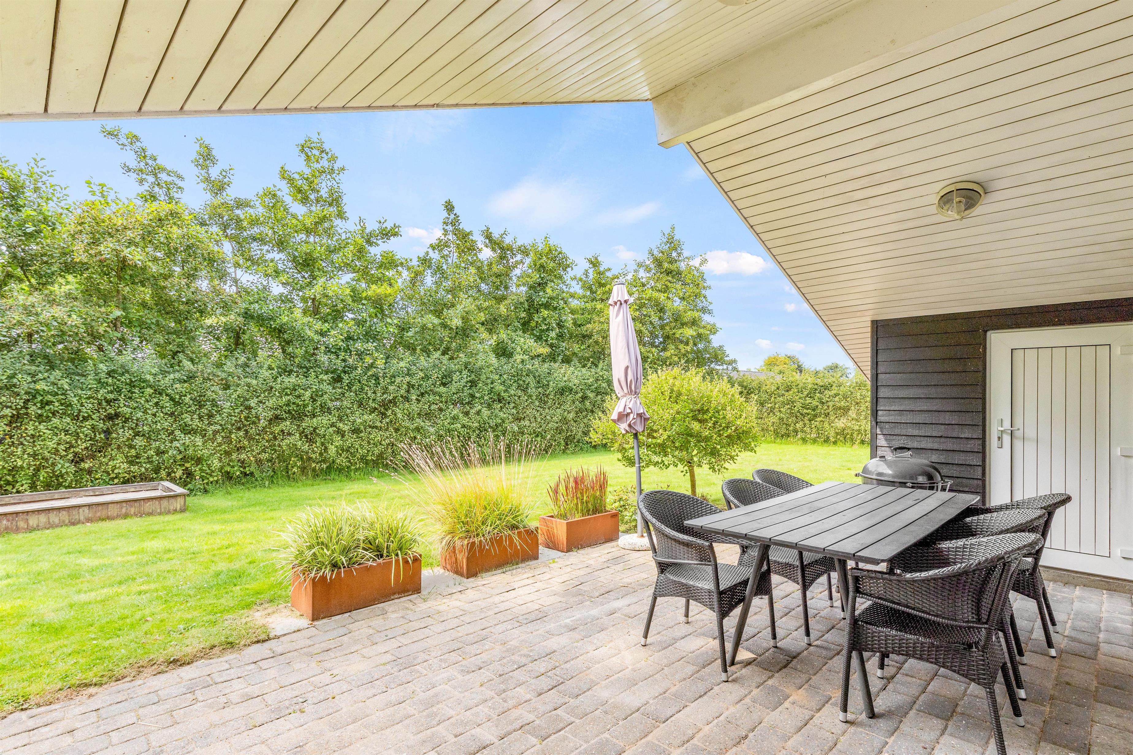 Den delvist afskærmede og overdækkede terrasse er det ideelle sted at nyde ferien udendørs. Her finder I både grill og havemøbler, perfekt til hyggelige måltider under åben himmel. Til de solrige dage er der også solvogne, hvor I kan slappe af og nyde solen. Fra terrassen kan I træde ud på den 1112 m2 store plænegrund, der byder på masser af plads til spil og leg. Børnene kan finde glæde i timers underholdning i både sandkassen og på gyngen. Mens I nyder jeres ferie, kan bilen stå i læ ved sommerhusets carport, og der er også et skur til opbevaring af cykler.