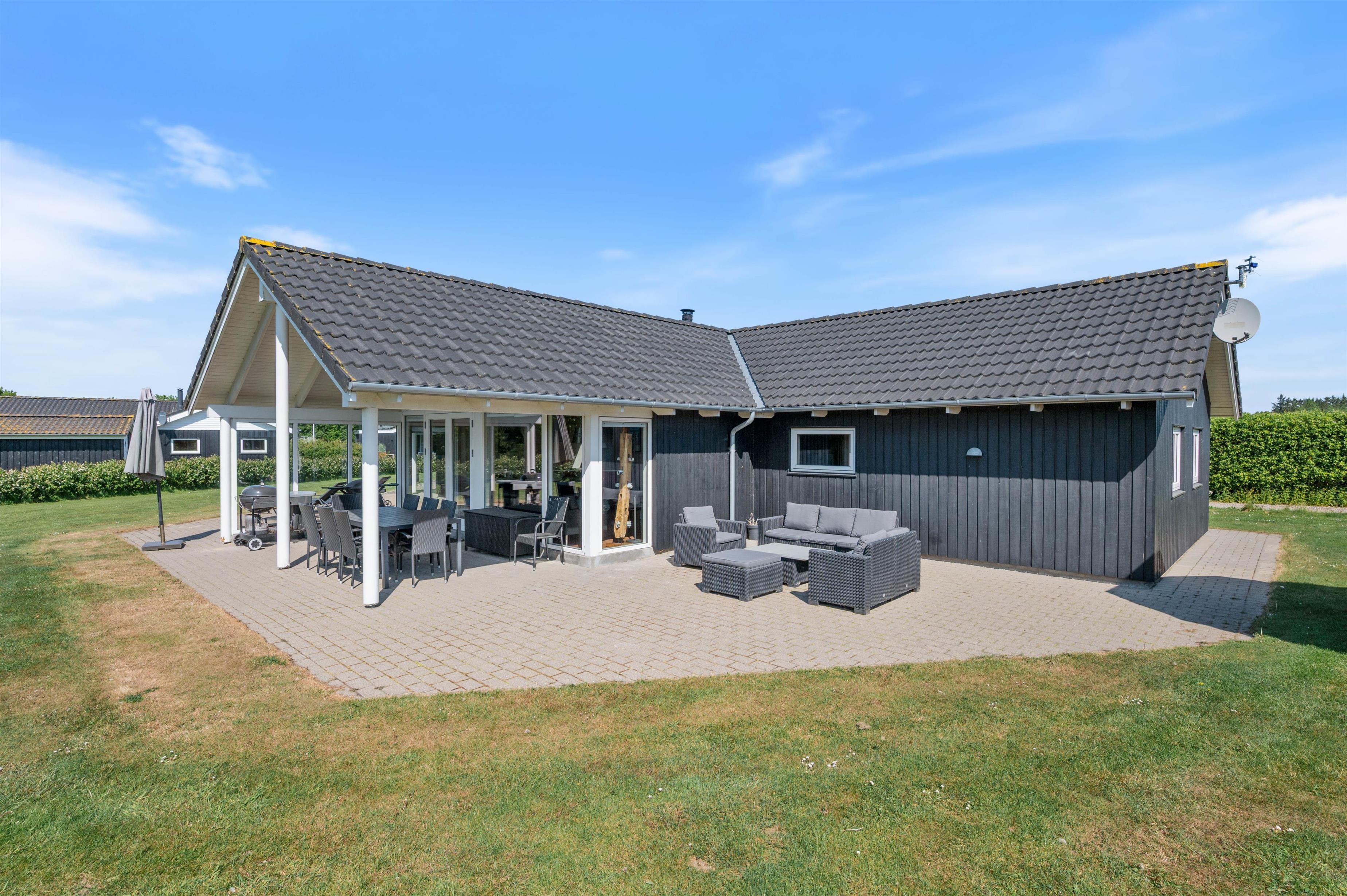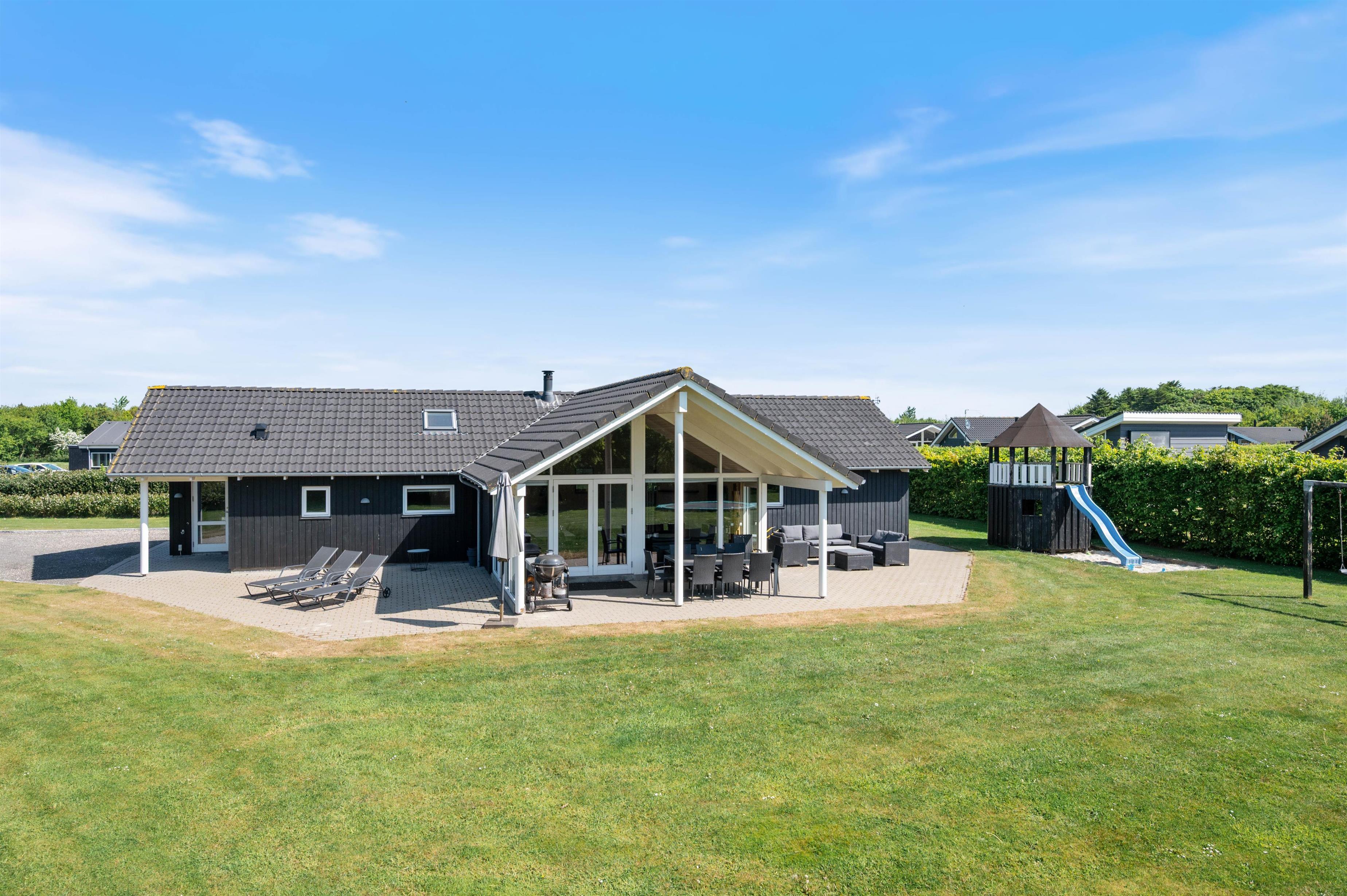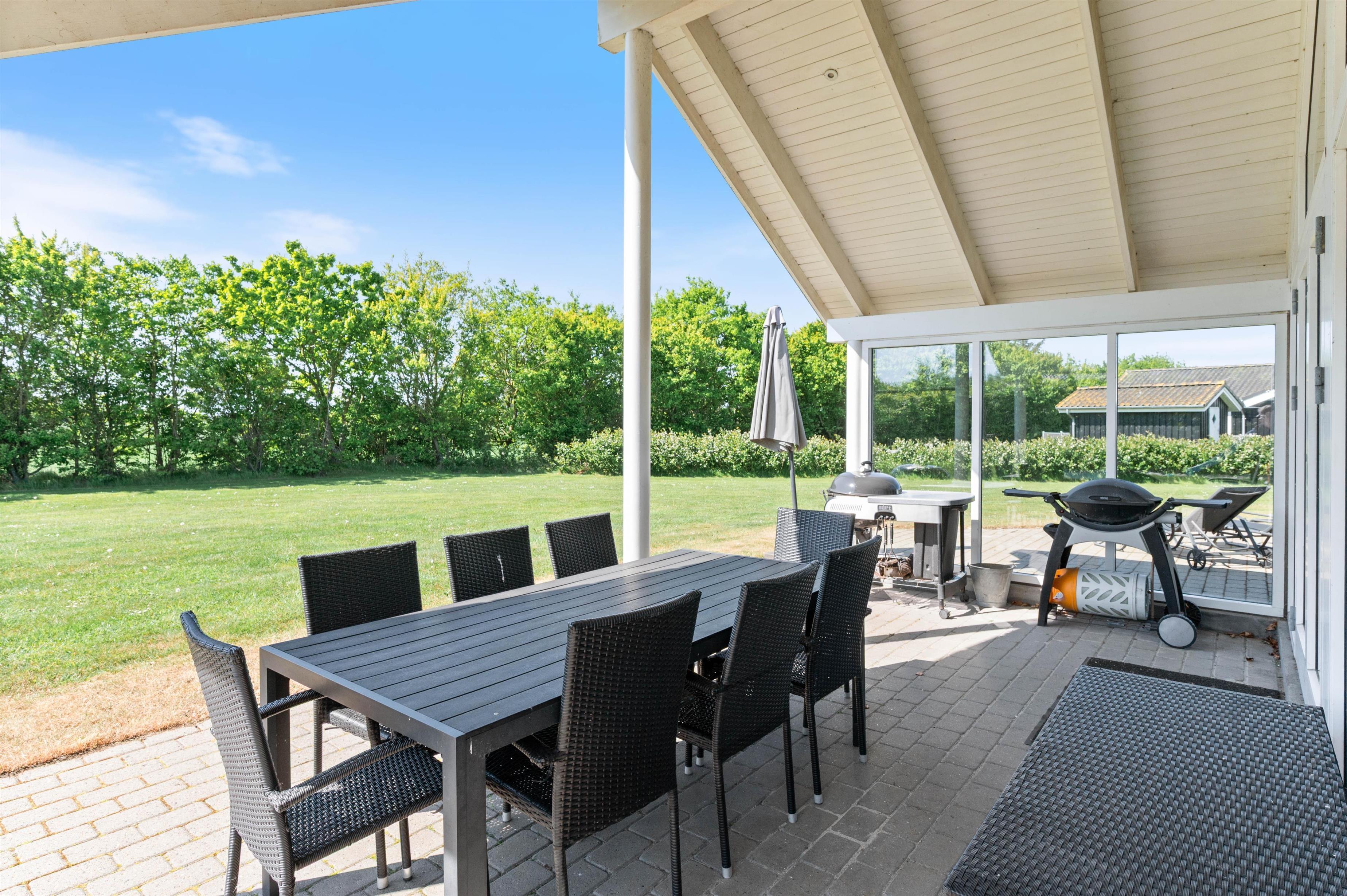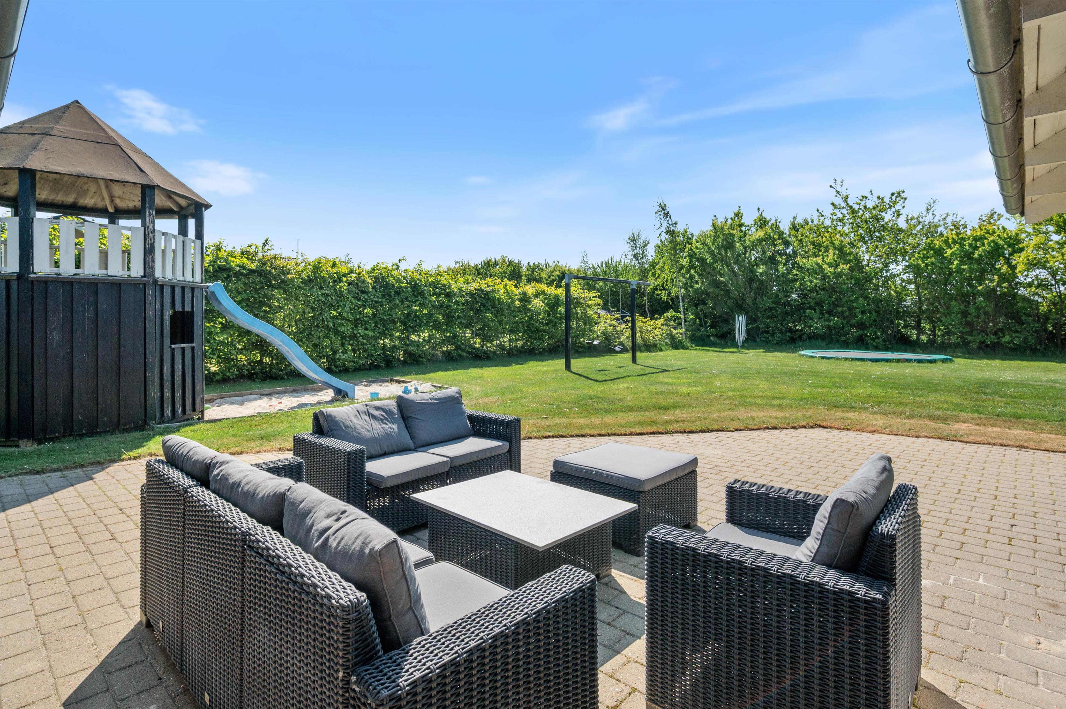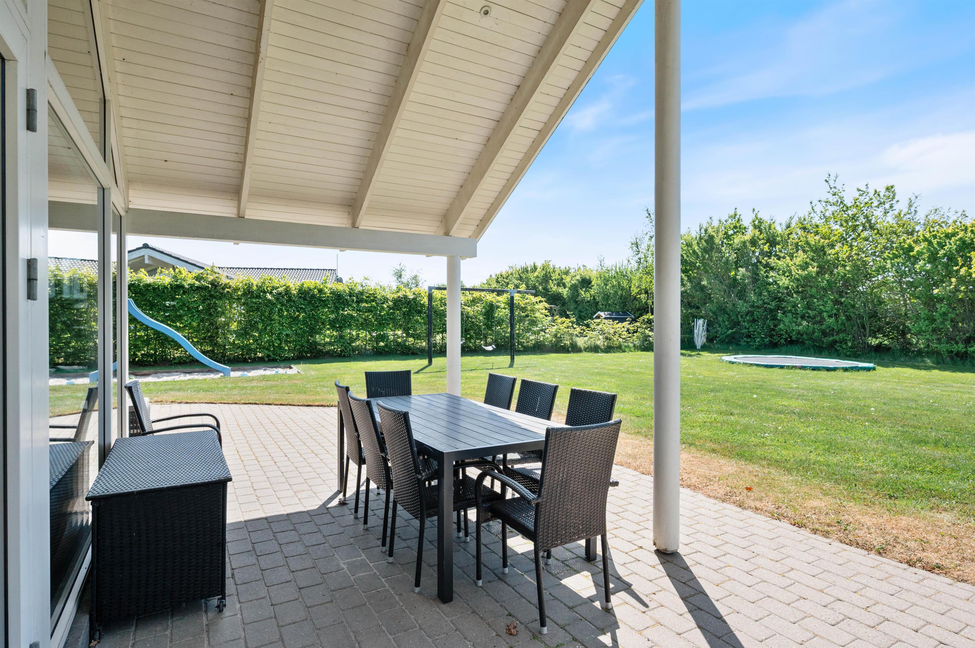 Fra stuen træder I ud på den overdækkede terrasse, hvor I kan nyde morgenkaffen i rolige omgivelser. Terrassen er stor og indbydende med komfortable møbler, der sikrer masser af afslapning og hyggelige grillmåltider. Mens de voksne nyder solen i solvognene med en spændende krimi, kan børnene more sig på gyngerne, på trampolinen eller slippe fantasien fri i legetårnet.