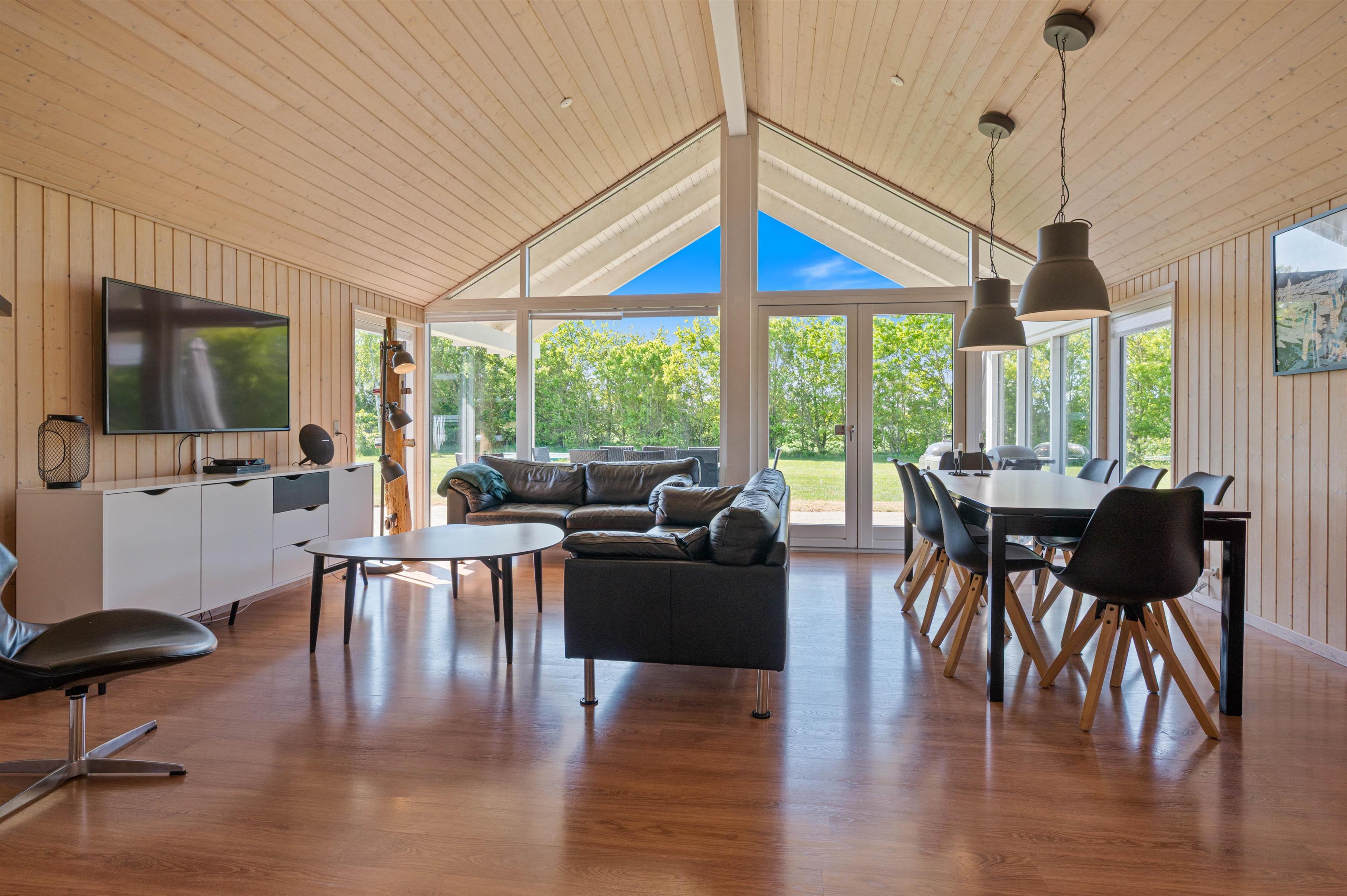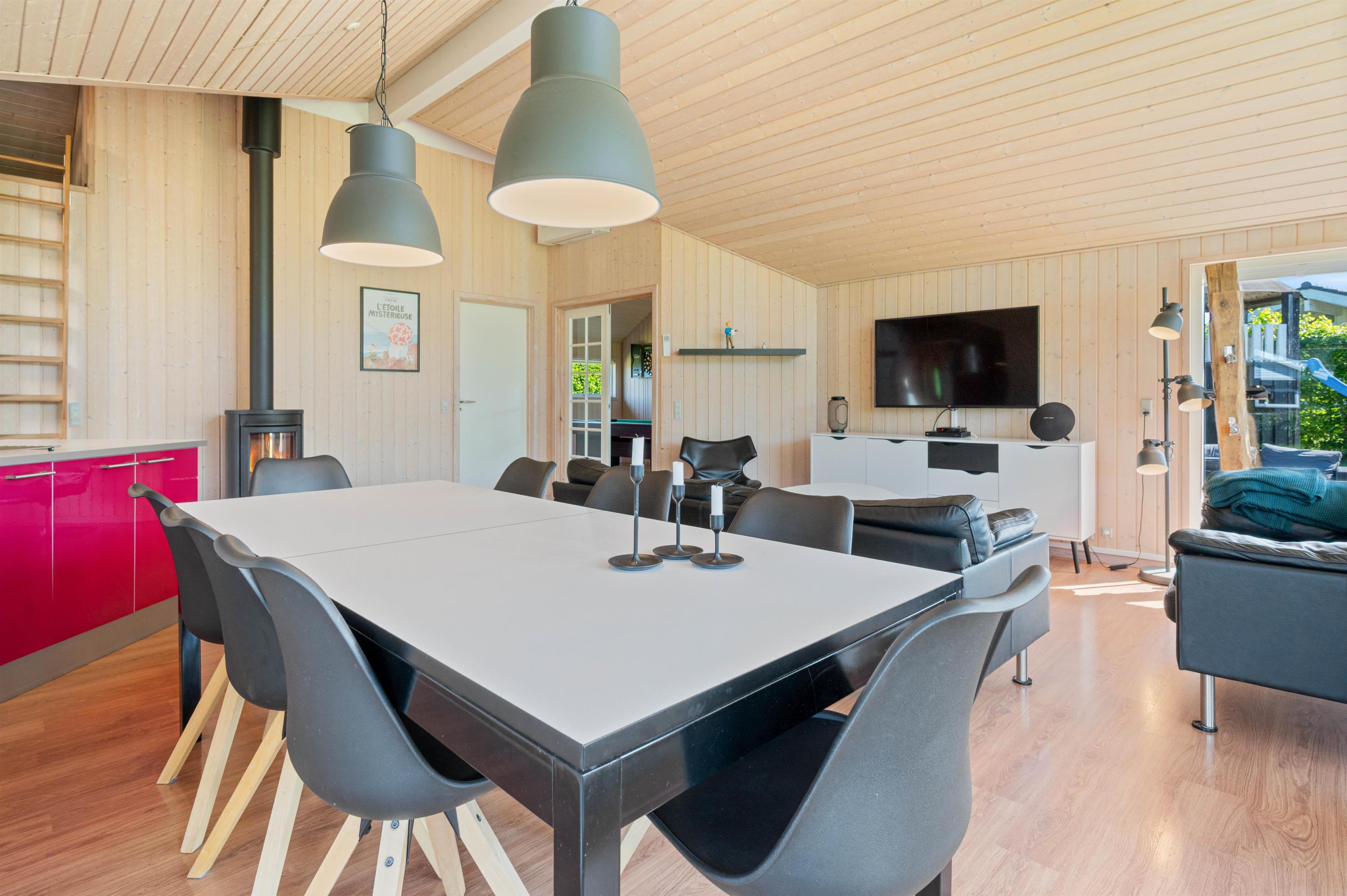 Når I træder indenfor i sommerhuset, vil I straks bemærke den lyse indretning og de store vinduer, der lukker masser af naturligt lys ind. Det åbne køkkenalrum gør det nemt at holde samtalen kørende mellem køkkenet og de bløde møbler i stuen. Her kan I også lune jer ved den hyggelige brændeovn, der skaber den helt rigtige sommerhusatmosfære.