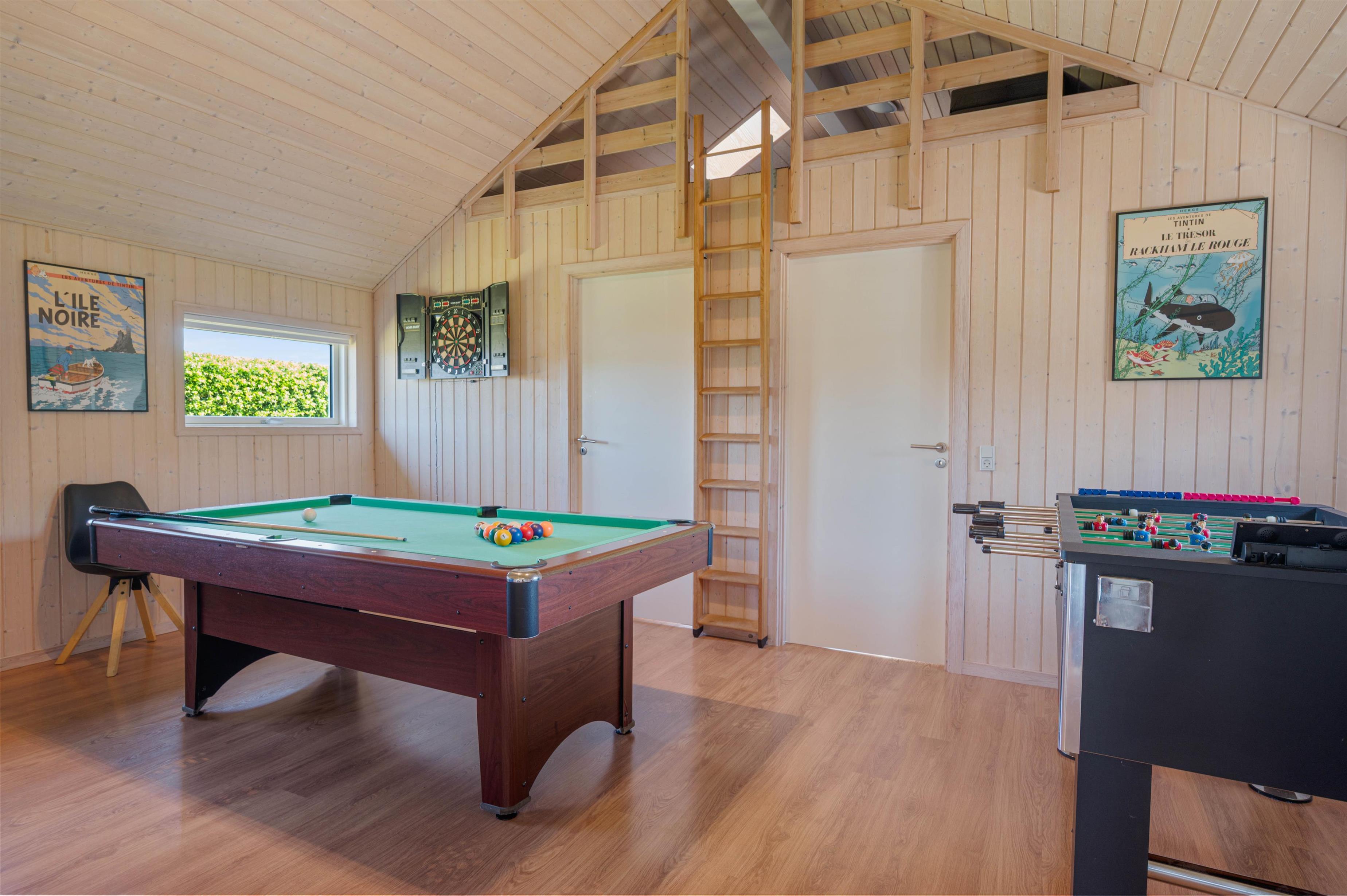 Aktivitetsrummet, som I kan træde ind i fra stuen, byder på billard, dart og bordfodbold – en oplagt mulighed for en mini-turnering. Fra aktivitetsrummet har I adgang til en hems, hvor der er både tv og PlayStation, og hvor børnene kan have deres eget fristed til leg og underholdning.