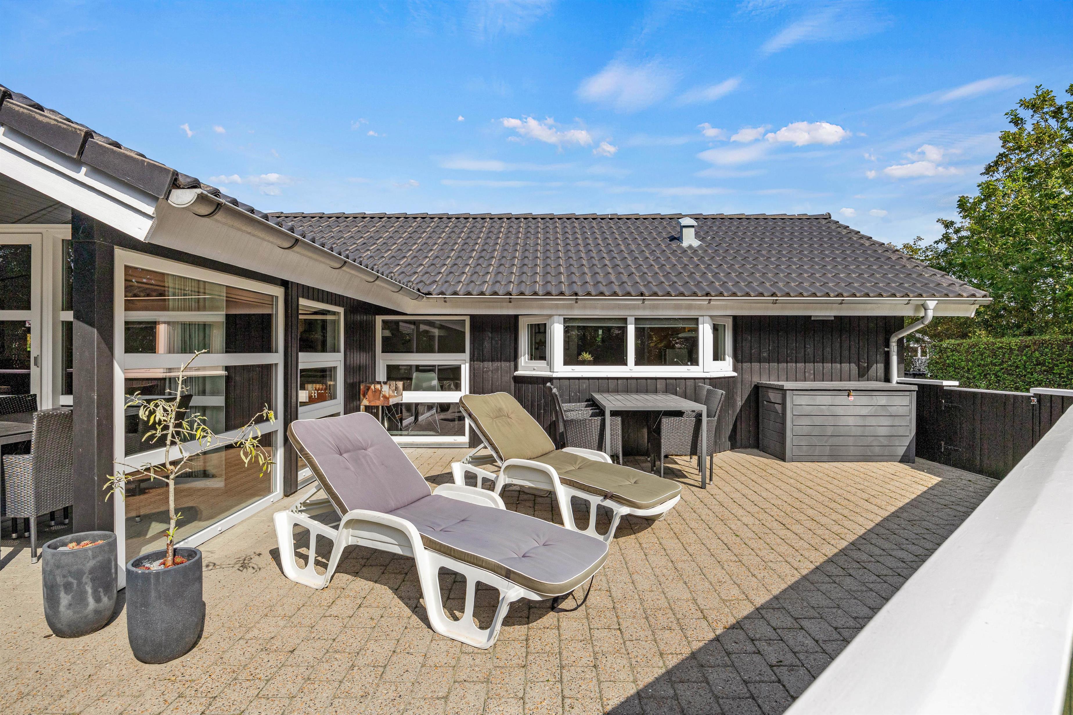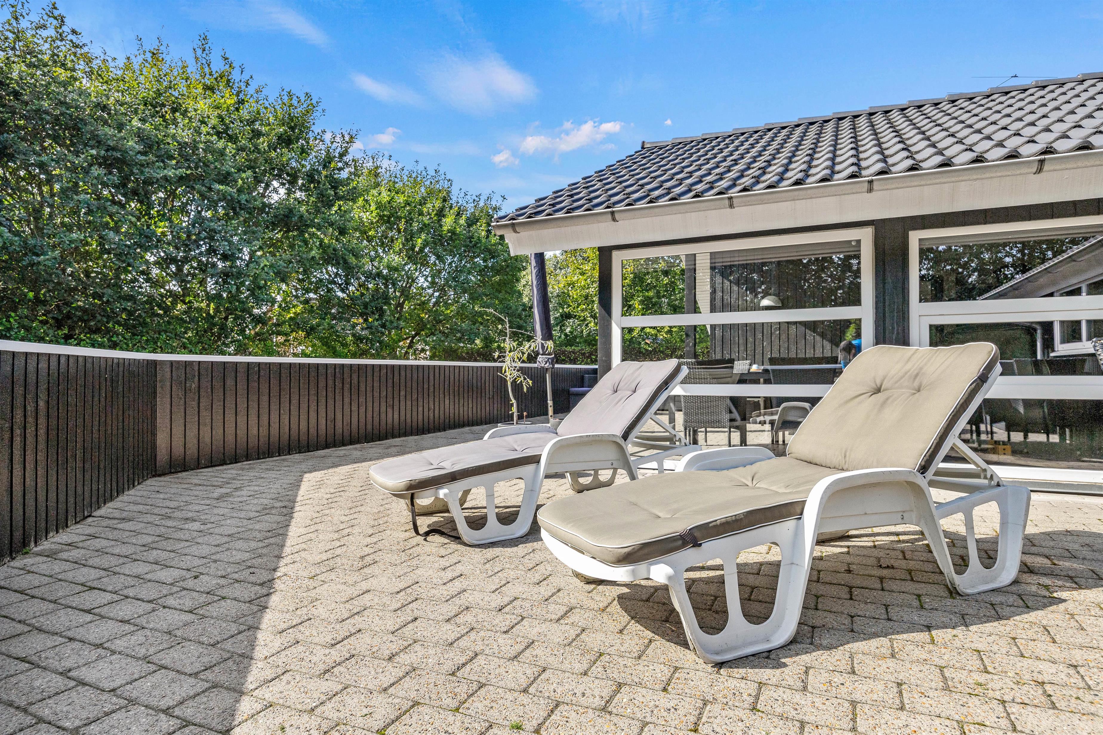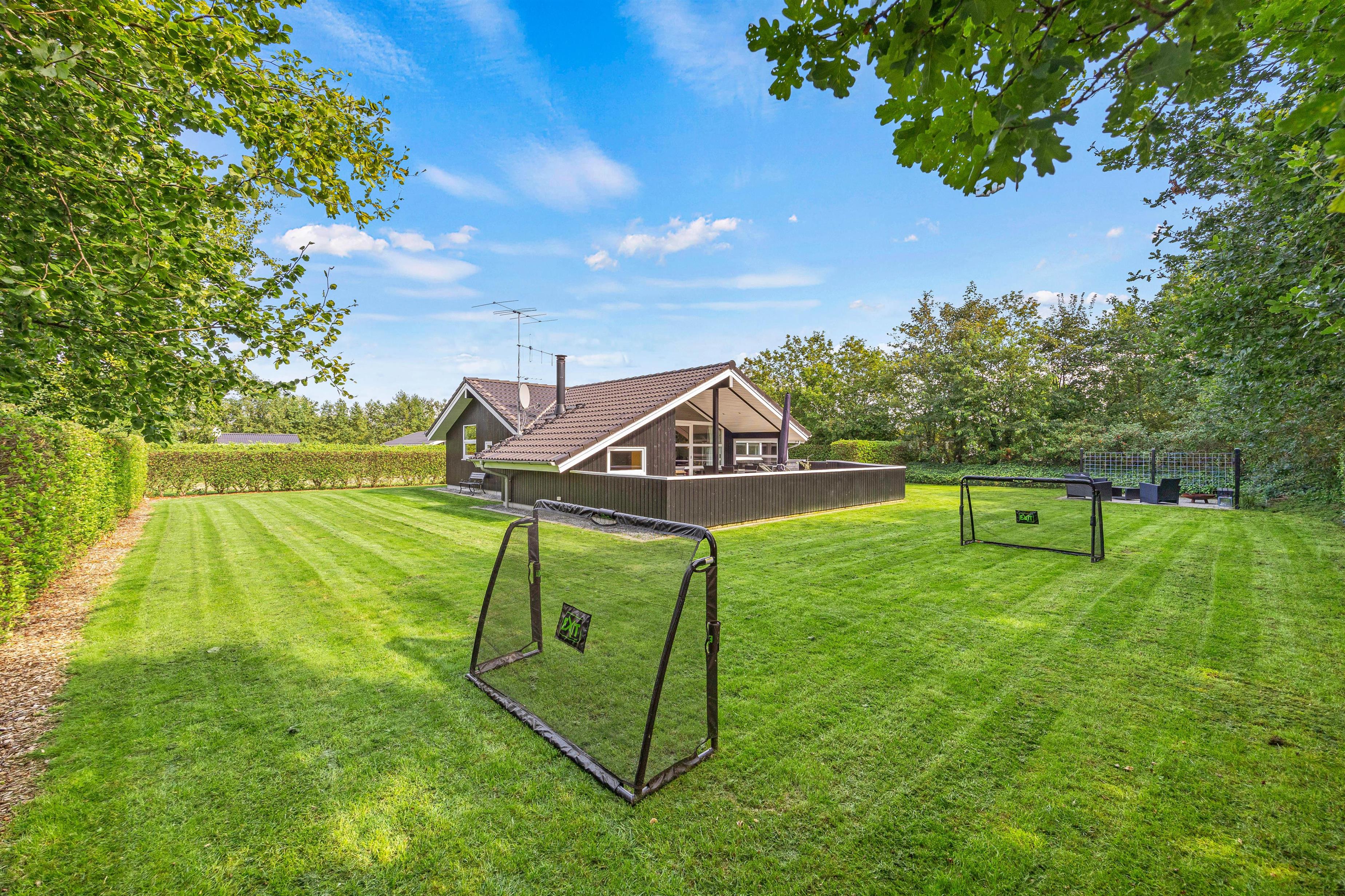 Udendørsområdet ved sommerhuset byder på en indbydende og aflukket terrasse, hvor I kan lade småbørnene boltre sig trygt og sikkert. Her finder I alt, hvad I behøver til en perfekt ferieoplevelse - fra grill til havemøbler, solvogne og en parasol, der skaber ideelle rammer for dage og aftener under åben himmel. Måske frister det med hjemmelavede burgere på grillen?