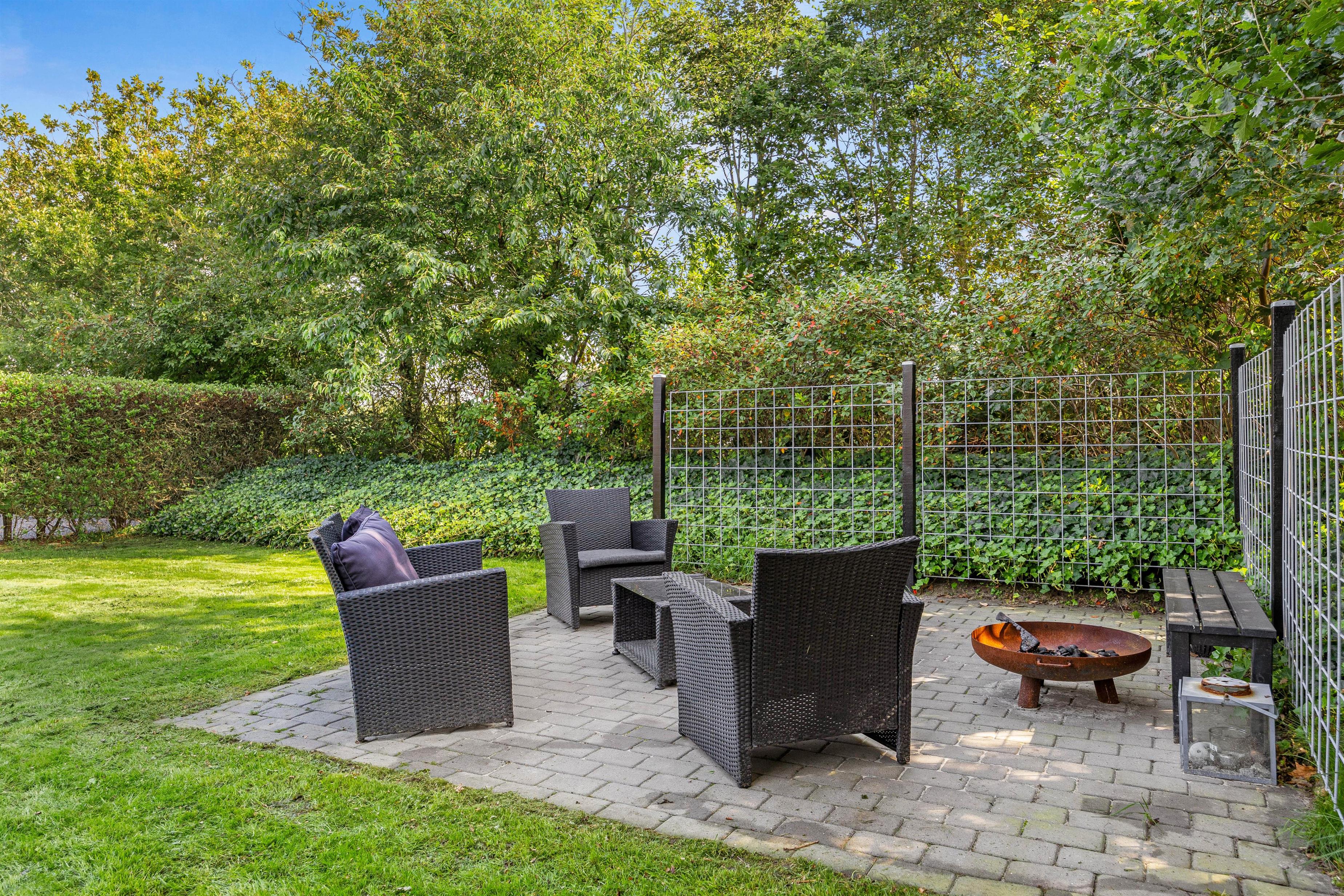 Fra terrassen kan I træde ud på den rummelige plænegrund, der strækker sig over hele 957 kvadratmeter og er perfekt til boldspil eller en omgang kongespil - måske endda en lille turnering? Der er også flere hyggelige kroge på grunden, så I altid kan finde en plads i solen til afslapning.