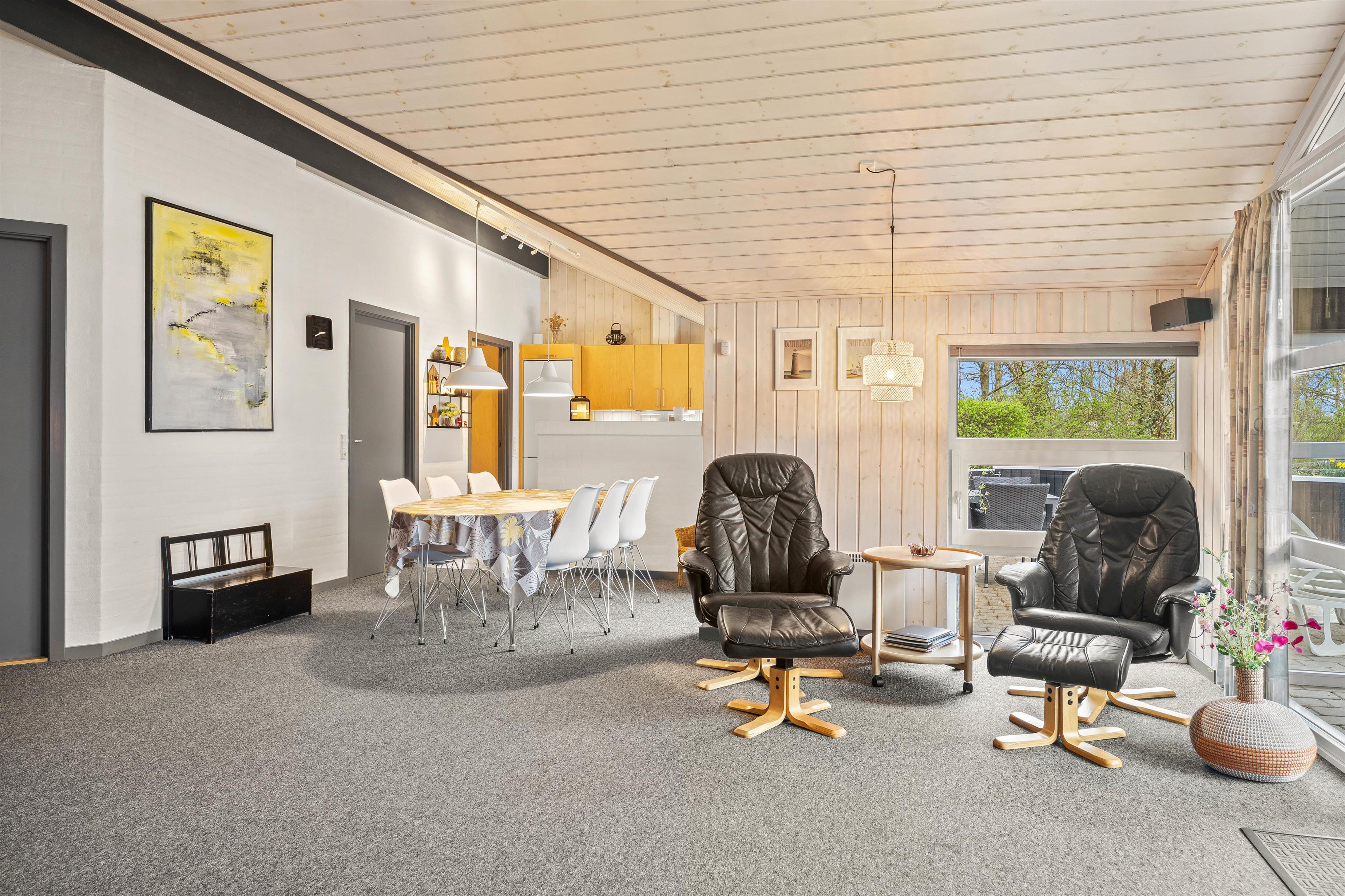 Inde i ferieboligen inviterer den åbne indretning til livlige samtaler, selv når nogen står ved komfuret og andre sidder omkring spisebordet og spiller kort eller lægger puslespil. Det er let at holde øje med, hvad der foregår nedenunder i stuen, hvor børnene måske fordyber sig i deres yndlingsserier på streamingtjenesten, mens I tryller i køkkenet.