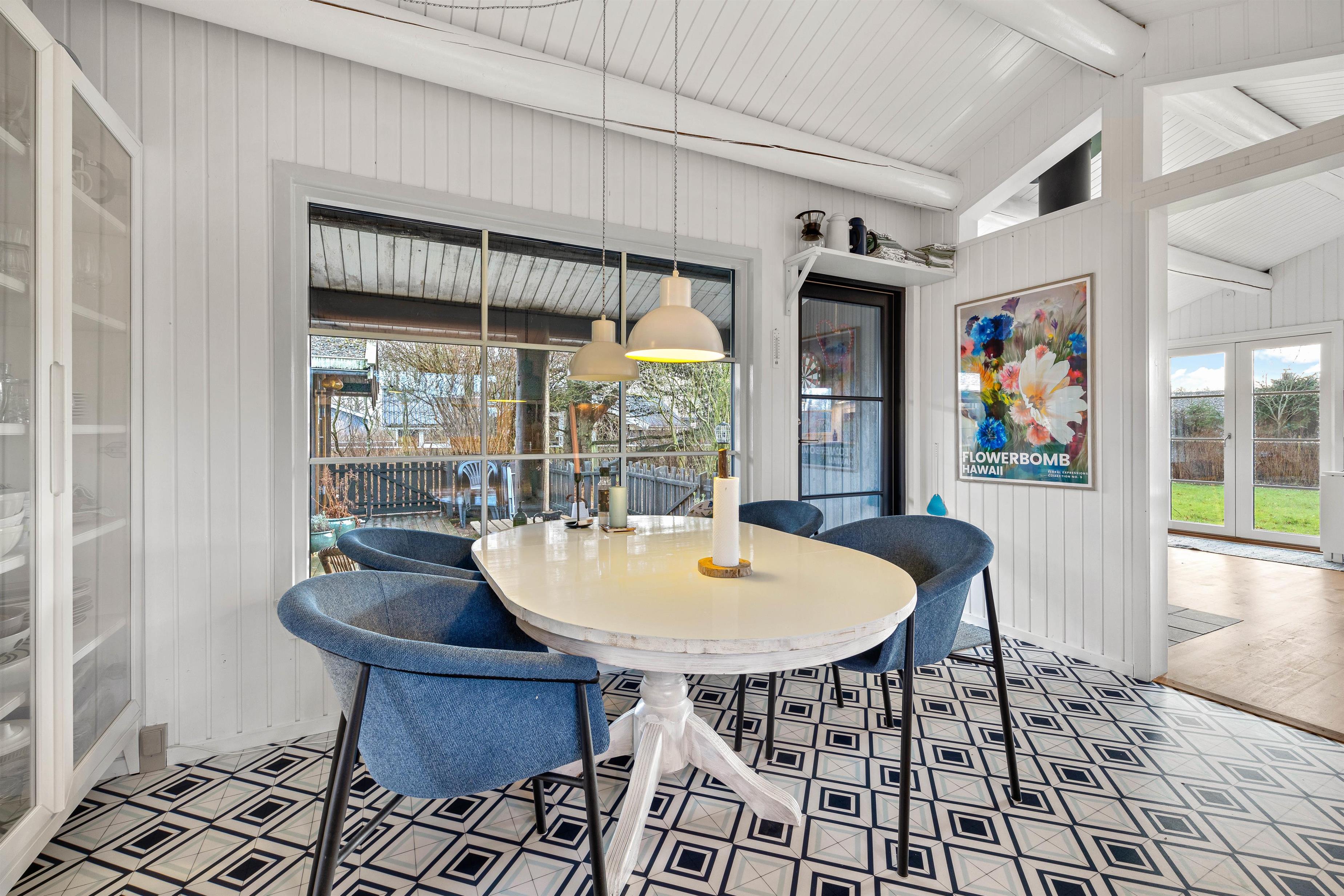 I sommerhuset på Tues Drøwt 44 i Bork bliver I budt velkommen af sommerhusets lyse og hyggelige indretning. De mange vinduer lukker masser af lys ind, som er med til at komplimentere indretningen i feriehuset.