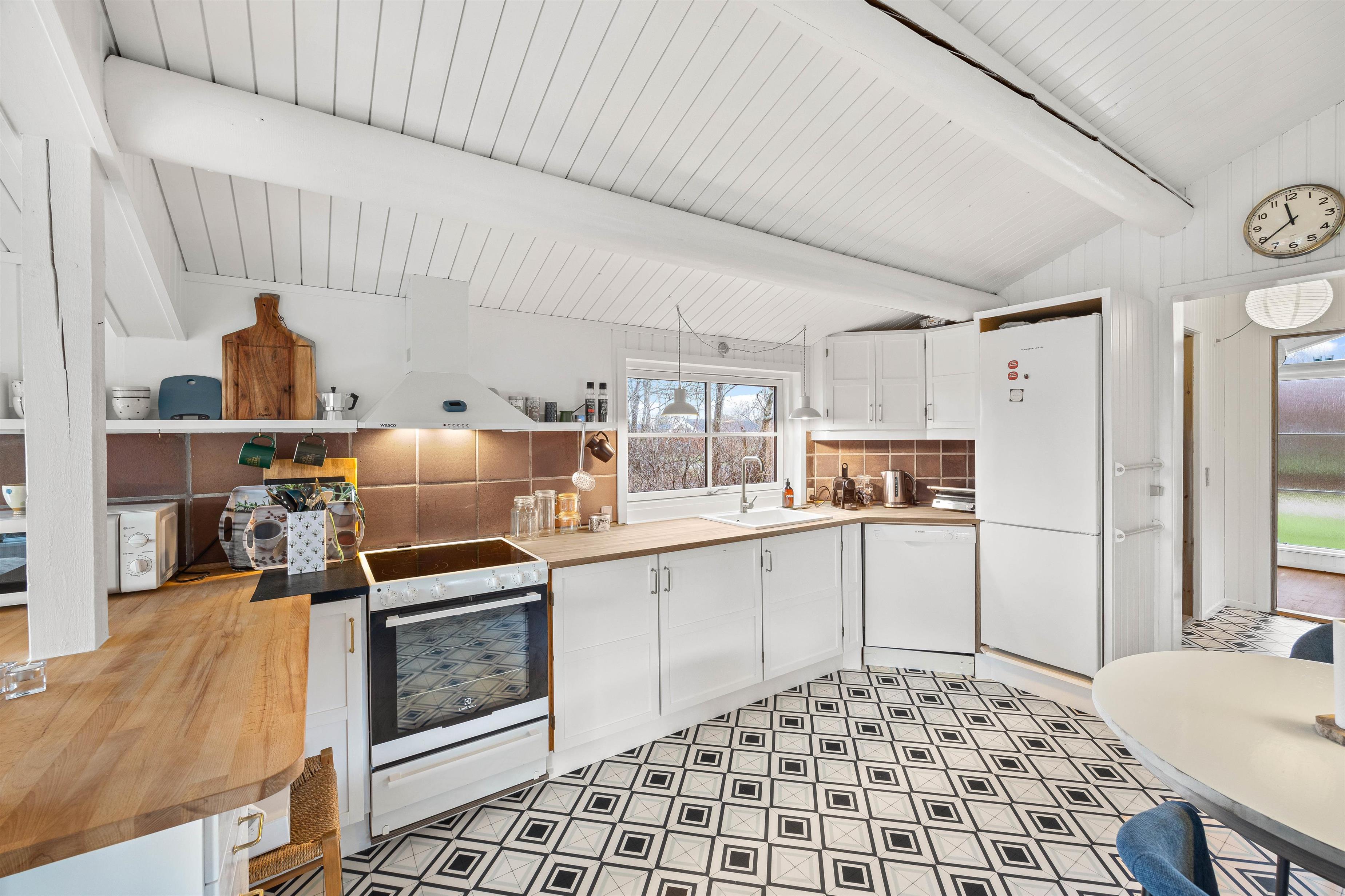 I det 80 kvadratmeter store sommerhus er der åben forbindelse mellem køkken, spiseplads og stue og der er derfor rig mulighed for, at I kan nyde hinandens selskab i løbet af ferien – også når I laver forskellige ting i det åbne rum.