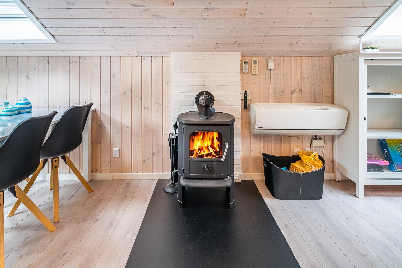 Hyggelig indretning – med brændeovn, varmepumpe og moderne komfort