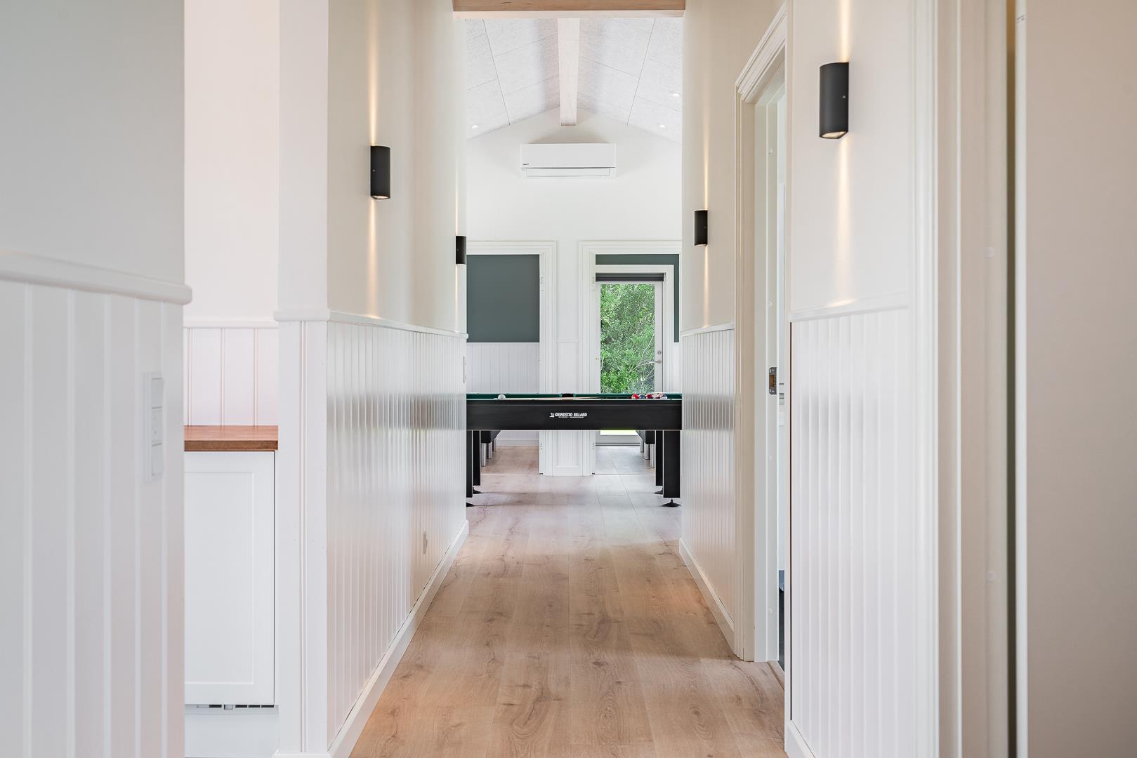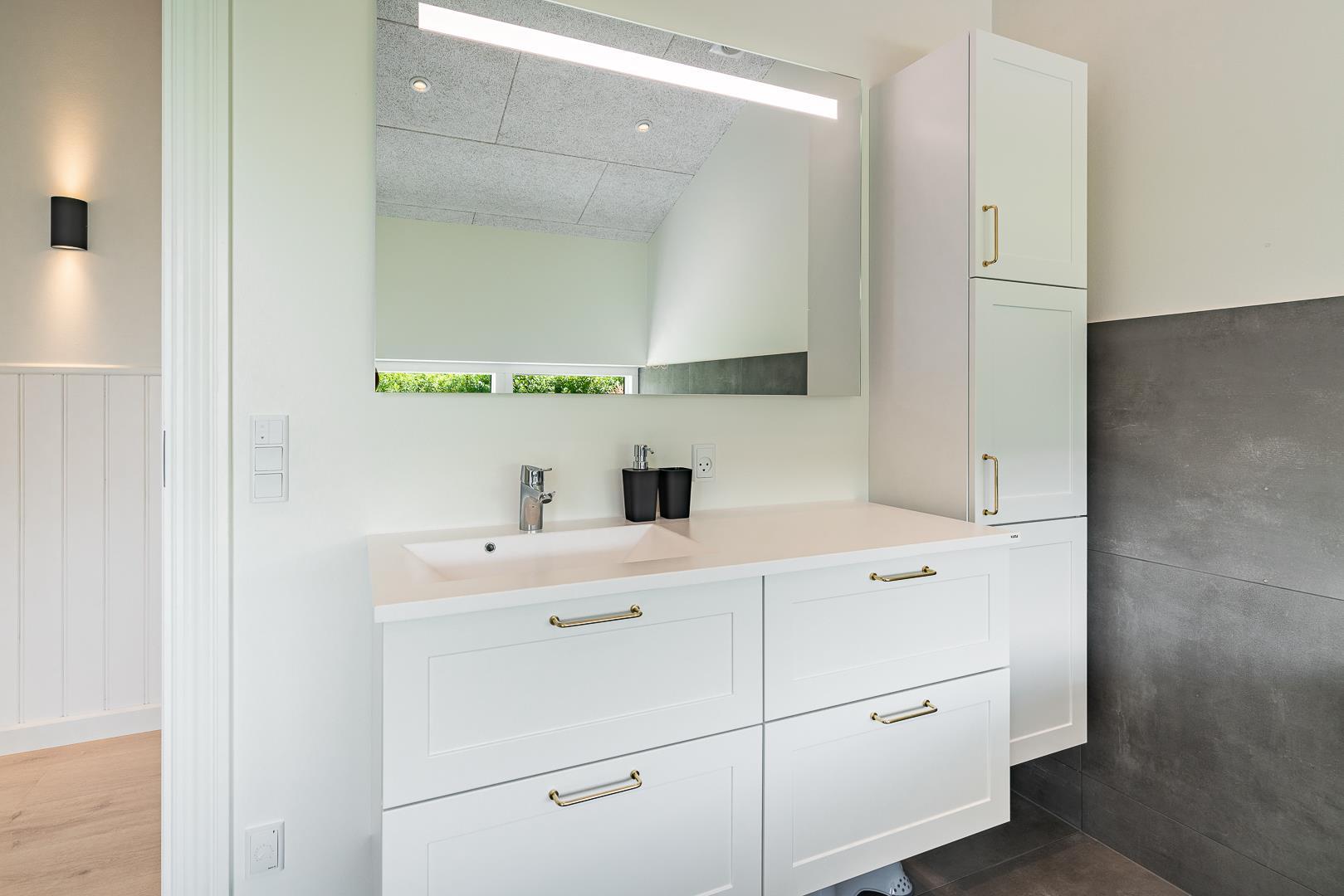 Sommerhuset har fire soveværelser, alle med dobbeltsenge – ideelt til både familier og par. De to badeværelser har gulvvarme, og i det ene finder I både spa og et lille badekar til familiens yngste.
