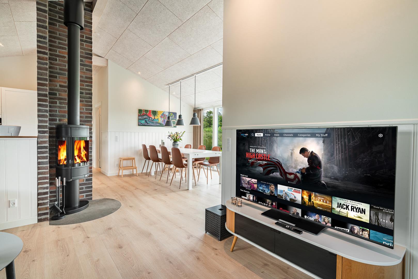 Den lyse og rummelige opholdsstue er sommerhusets hjerte. Her strømmer dagslyset ind gennem de store vinduer, og brændeovnen skaber varme og hygge, når vejret viser sig fra sin kølige side. Varmepumpen sikrer samtidig et behageligt indeklima året rundt.