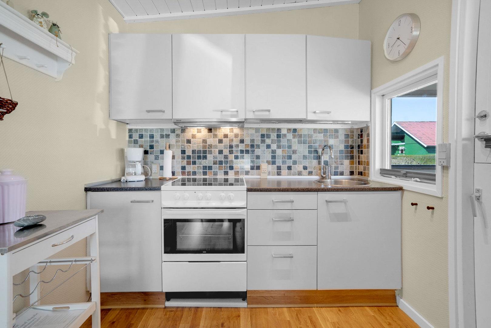 Det åbne køkken er godt udstyret og indbyder til hyggelig madlavning og samvær.