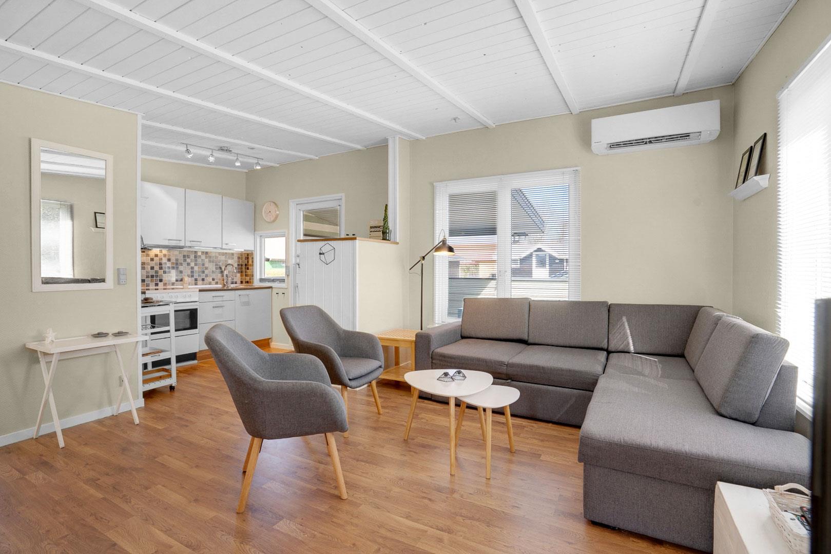 Sommerhuset er lyst, moderne og smagfuldt indrettet. Opholdsstuen har en hyggelig sofakrog, TV og varmepumpe, så I kan nyde opholdet året rundt – både på kølige forårsdage og varme sommeraftener.