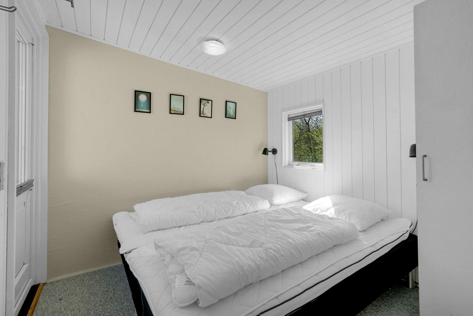 Der er to soveværelser – et med dobbeltseng og et med køjeseng – og et badeværelse med bruser og toilet.