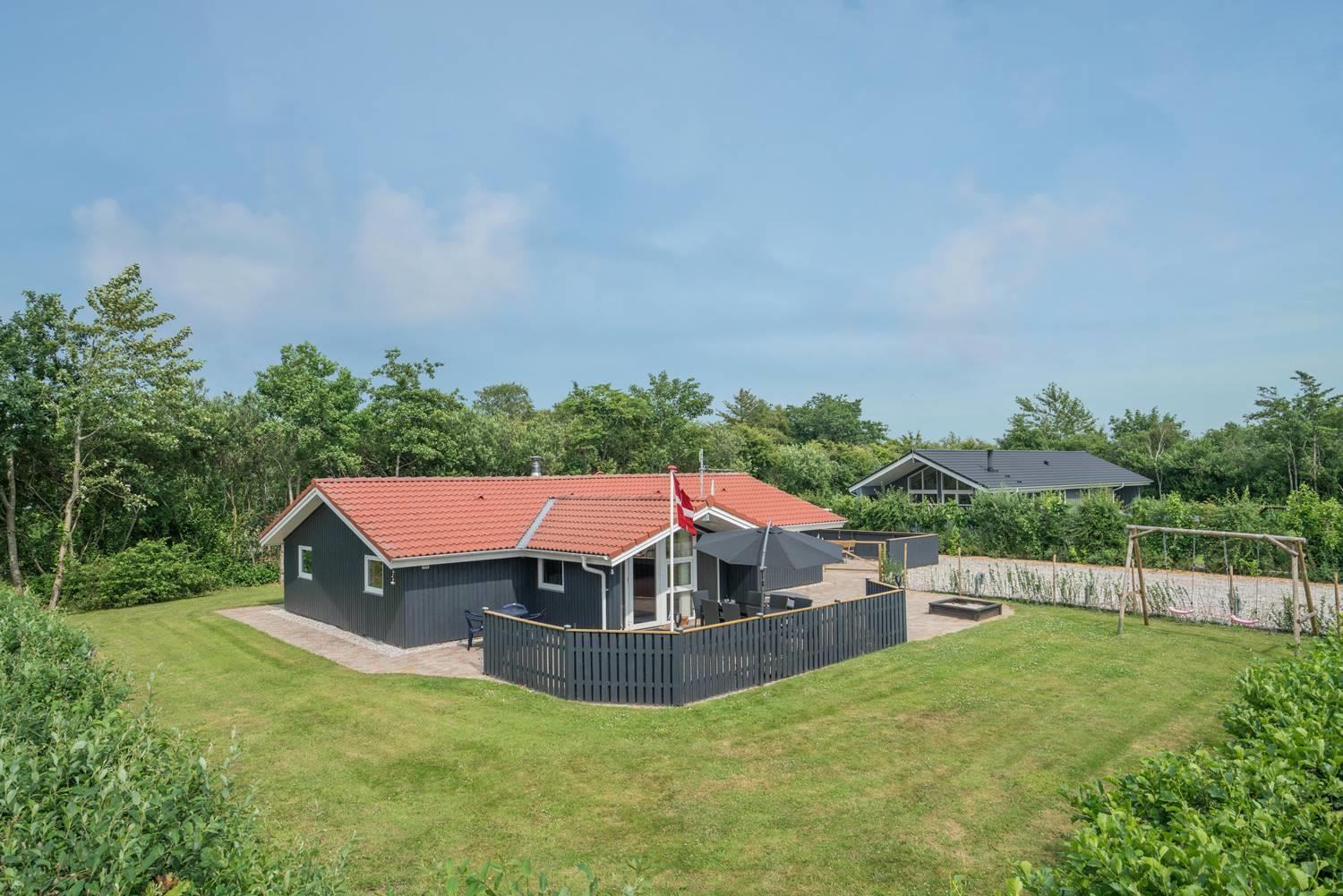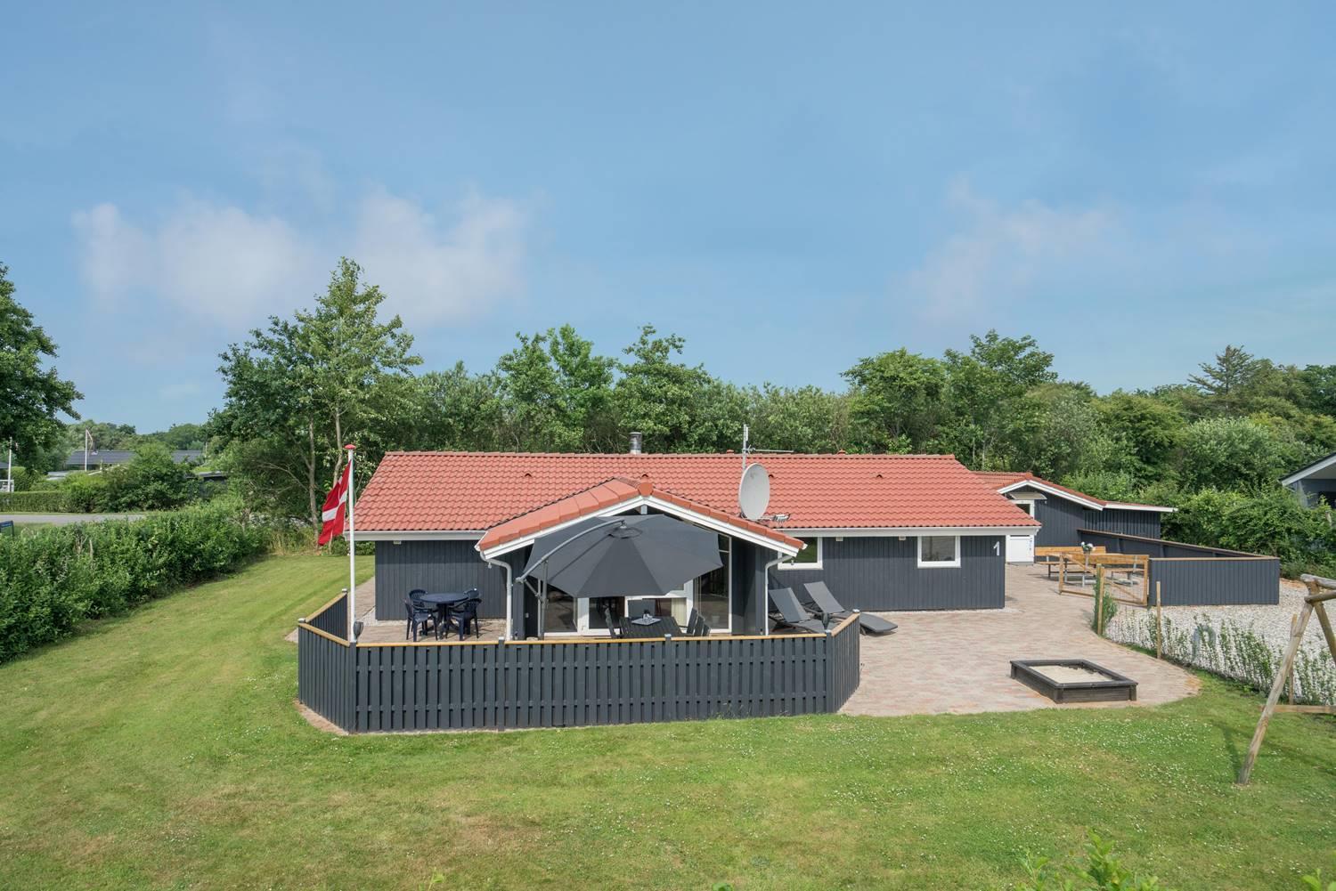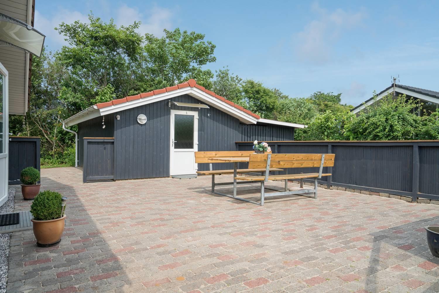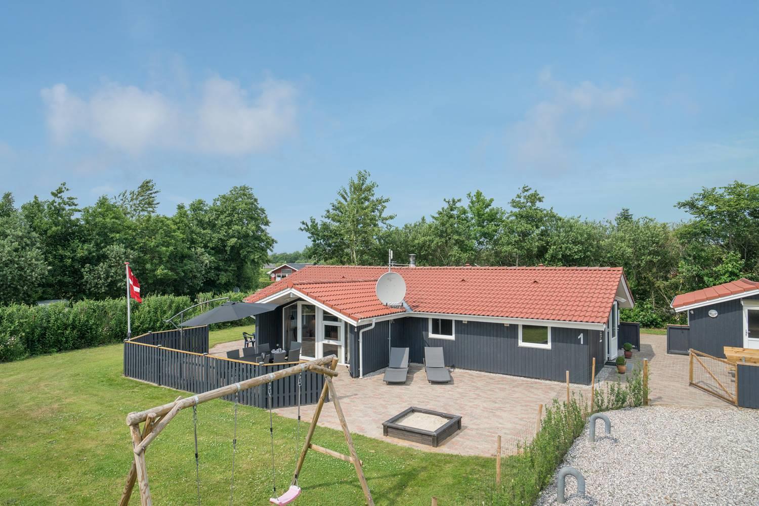 Den store, indhegnede have giver masser af plads til leg, boldspil og afslapning. For børnene er der gynge og sandkasse, og på den overdækkede terrasse kan I nyde jeres måltider og de lange sommeraftener – også når vinden frisker op.