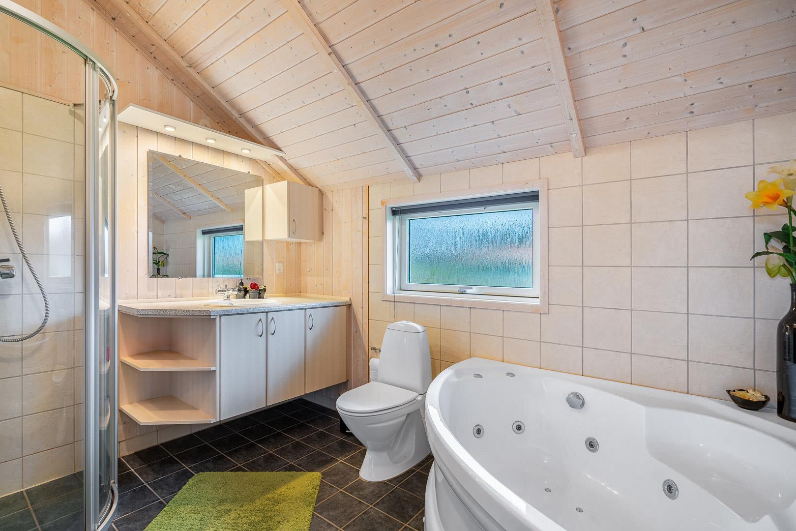 Et stort plus ved ssommerhuset er den private sauna og spa. Her kan I nyde aftenen med fuld afslapning, mens vinden måske suser udenfor. Udover hovedbadeværelset findes der også et praktisk gæstetoilet.
