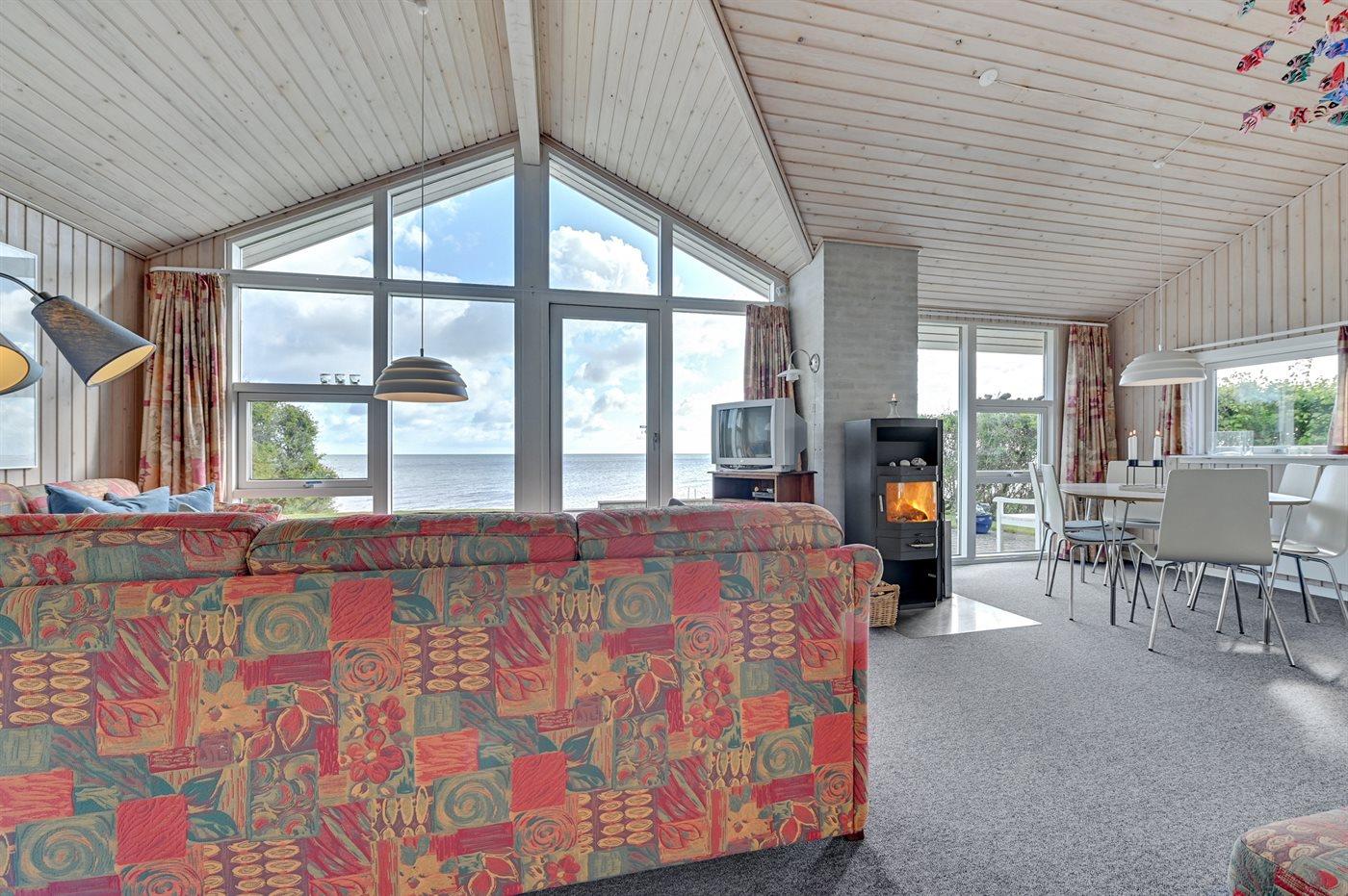 Nyd panoramaudsigten over havet fra dette charmerende sommerhus med anneks og stor træterrasse ved vandkanten.