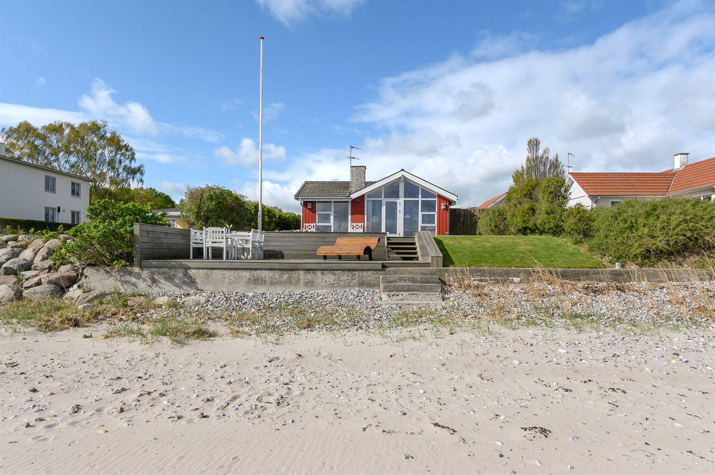 Dette dejlige sommerhus ligger kun 5 m fra vandkanten med en vidunderlig panoramaudsigt over havet. Til huset hører bl.a. en stor og lækker træterrasse, som går helt ned til stranden. Desuden tilhørende anneks, hvor 3 af sovepladserne befinder sig.
