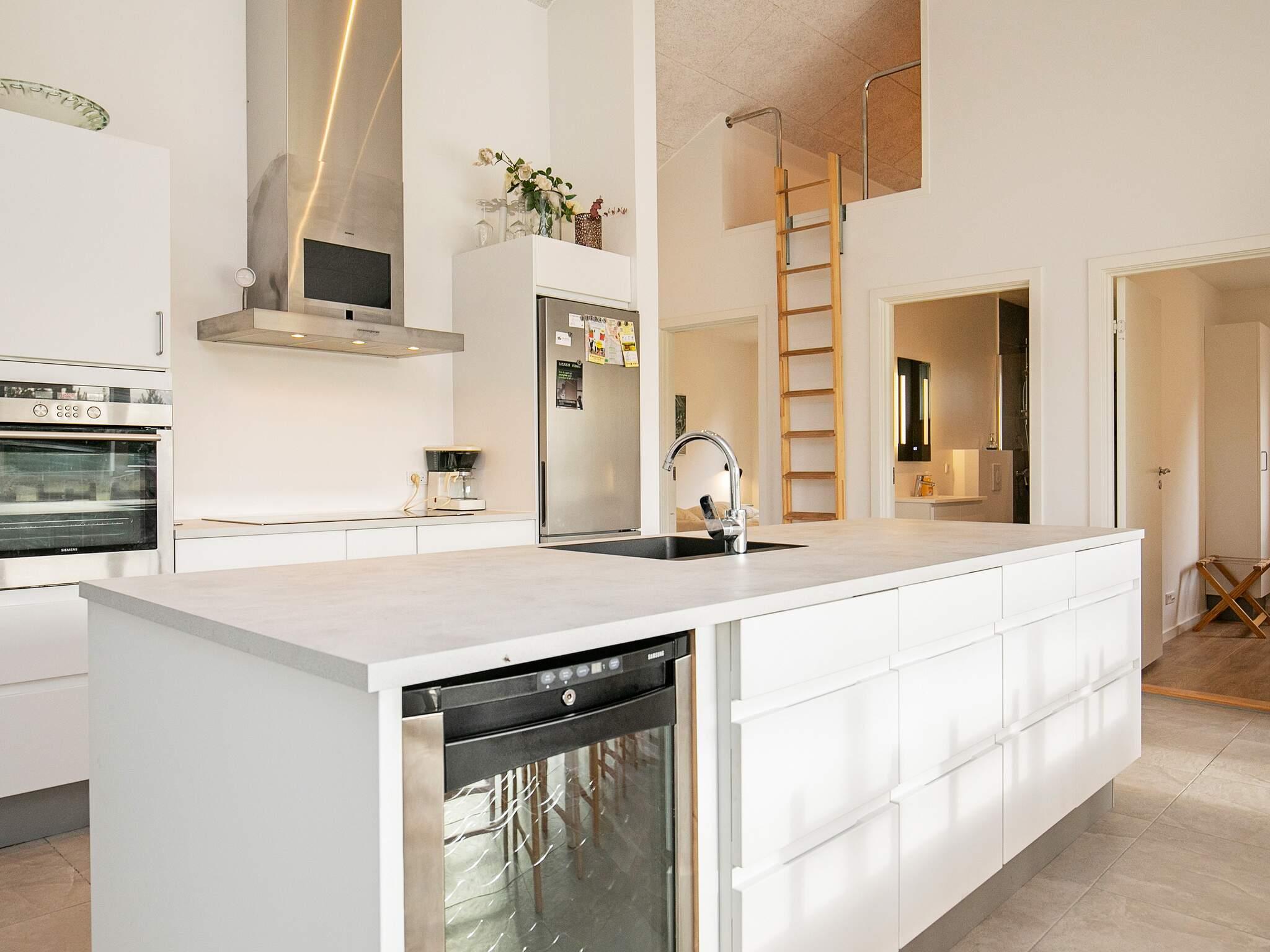 Der er stort, åbent opholdsrum med køkken, spiseplads og stueafdeling – et dejligt rum med højt til loftet og vinduesparti, hvor det nordjyske lys giver et godt lysindfald.