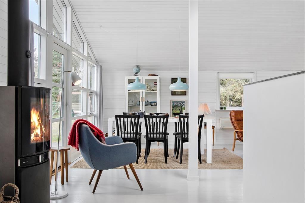 Indenfor byder sommerhuset på en varm og indbydende atmosfære. De lyse rum er indrettet med stor opmærksomhed på komfort og hygge, så du med det samme føler dig hjemme. I stuen kan du nyde den knitrende varme fra brændeovnen, mens du kigger ud på den flotte natur. Er du til ekstra afslapning, kan du forkæle dig selv med et spabad i det indendørs wellnessområde. De hyggelige rum giver masser af plads til samvær med familie og venner, og den smukke udsigt fra vinduerne gør det endnu mere fristende at blive inde og slappe af i de lyse omgivelser.