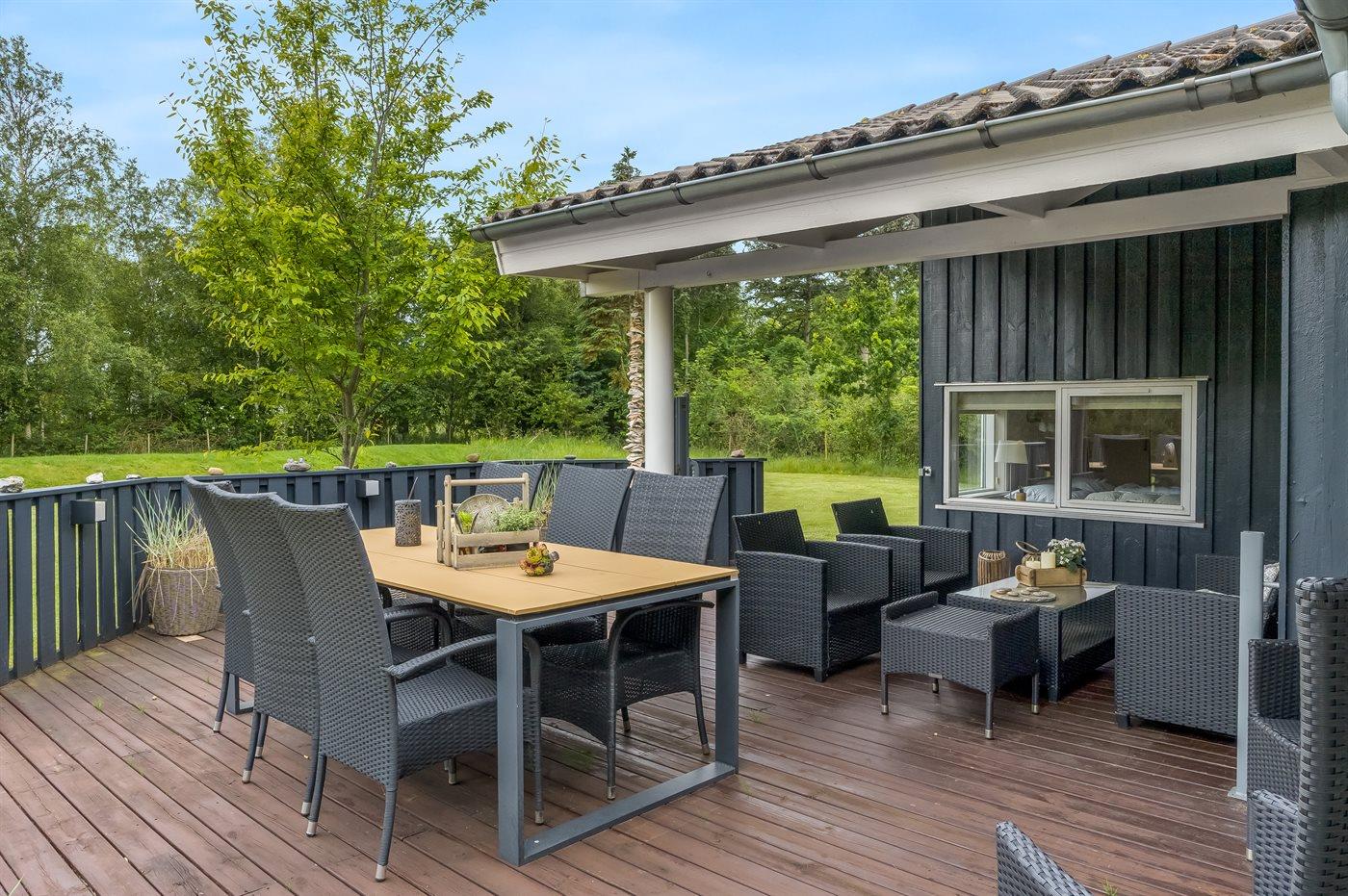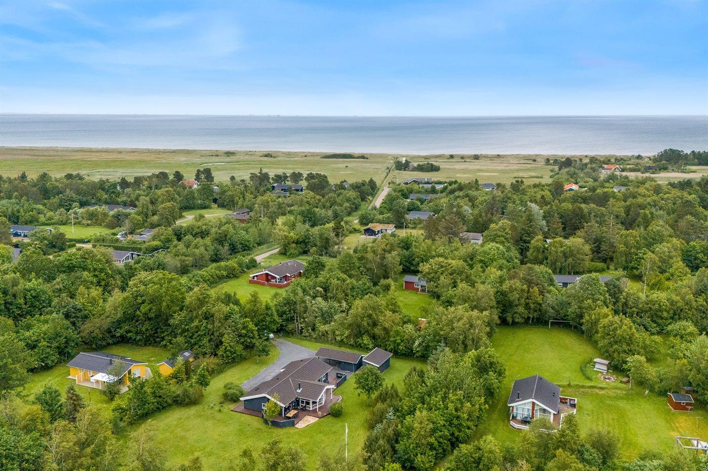 Ferieboligen er beliggende på en 2500 m² stor naturgrund. Grunden er indhegnet. Der er 550 m til havet. Der er en badebro i nærheden. Nærmeste forretning er beliggende i en afstand af 2000 m. Til ferieboligen hører åbent terrasseareal. Desuden er der overdækket terrasse. Der er redskabsrum. Der ligger en legeplads i en afstand af 2000 m. Der er carport til rådighed. Der er installeret stik til opladning af elbil. Type 2 stik. Parkering ved ferieboligen.