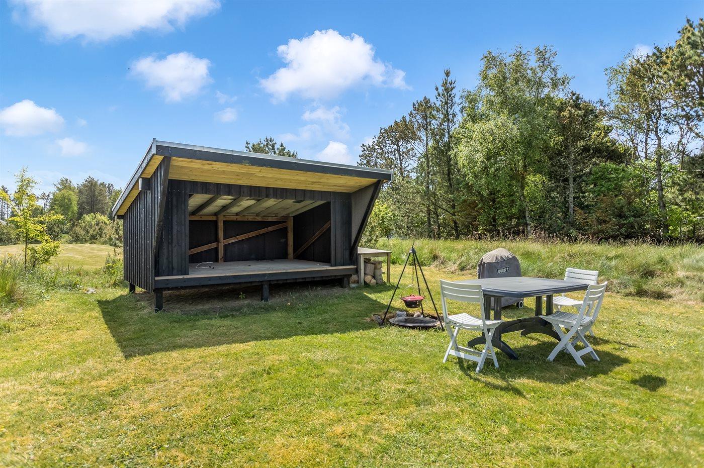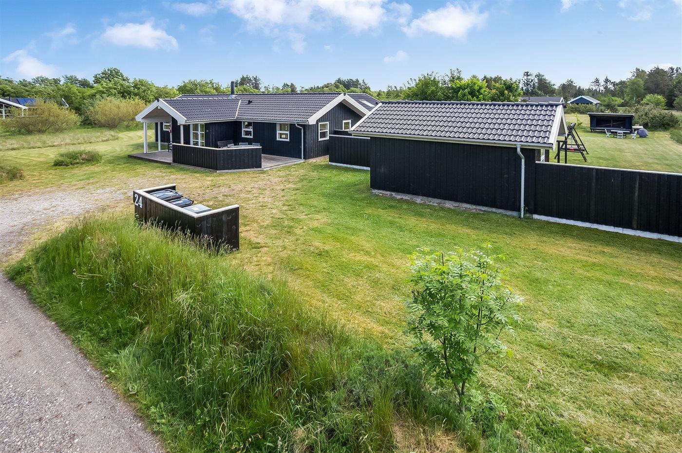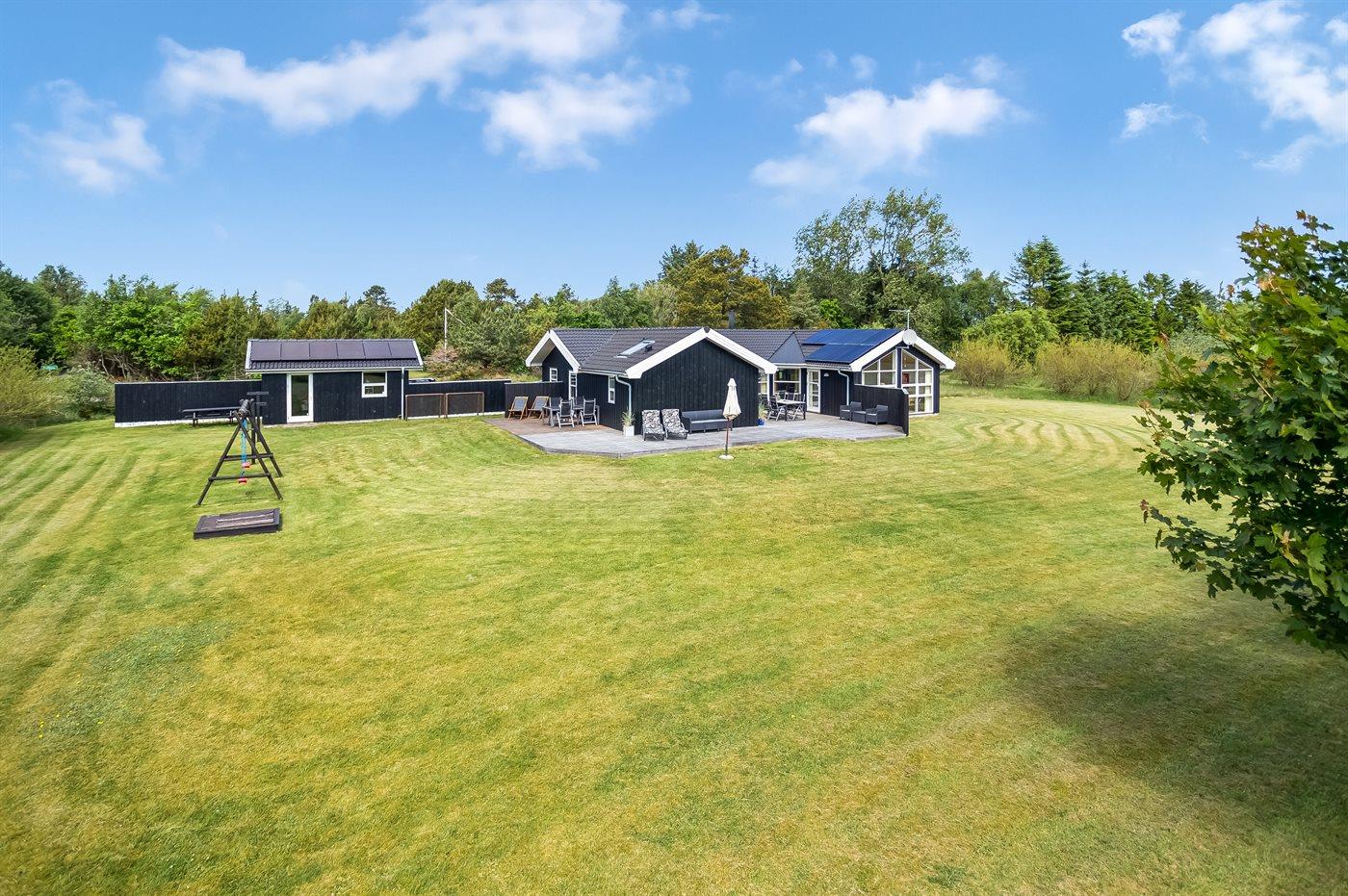 Ferieboligen er beliggende på en 2500 m² stor naturgrund. Der er 400 m til havet. Nærmeste forretning er beliggende i en afstand af 1800 m. Til ferieboligen hører åbent terrasseareal. Desuden er der overdækket terrasse. Der er redskabsrum. Gynge. Sandkasse. Legetårn. Fodboldmål. Bålsted. Shelter. Grill til rådighed. Der er installeret stik til opladning af elbil. Med 3,5 kW ladeeffekt. Parkering ved ferieboligen.