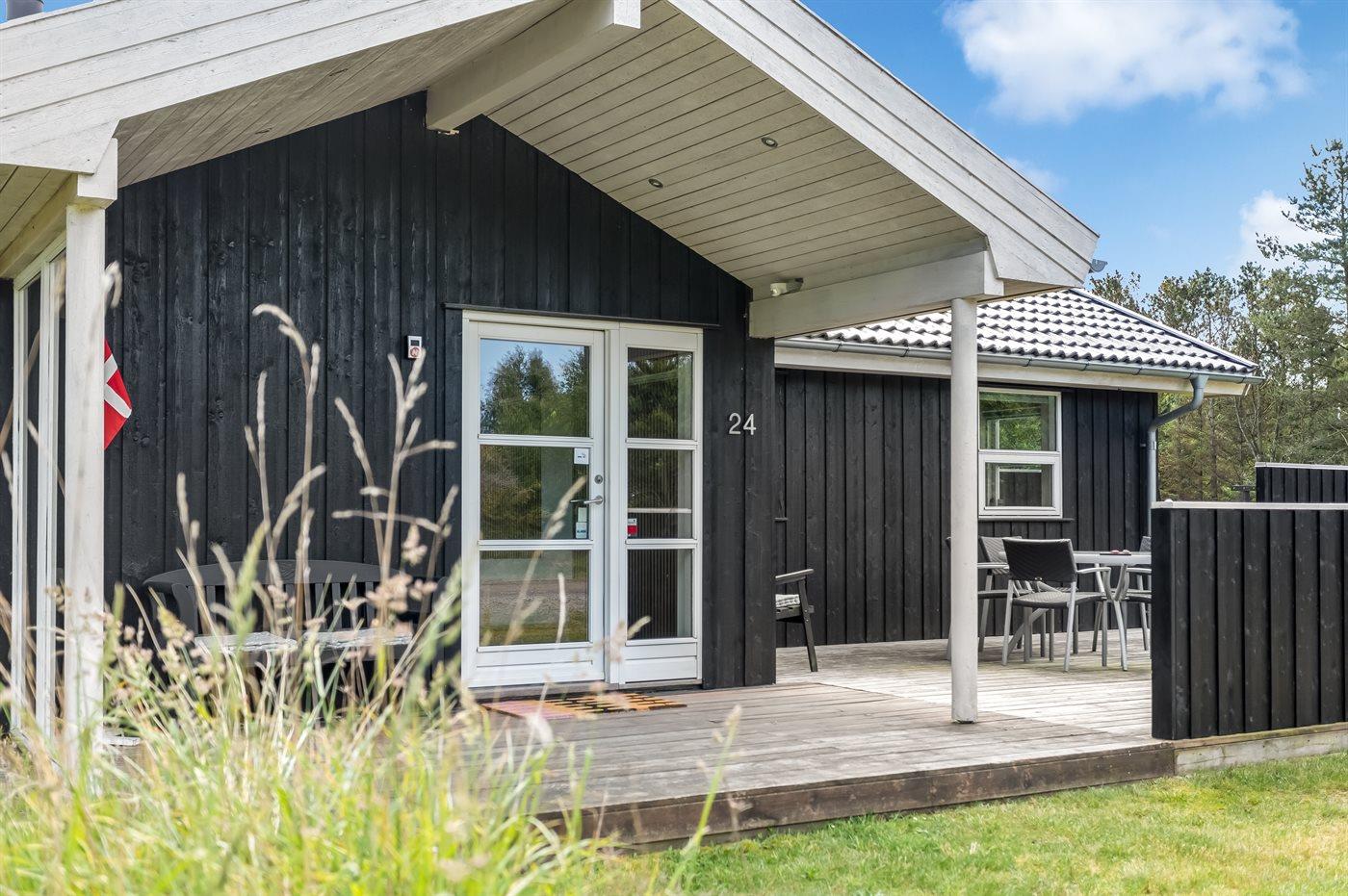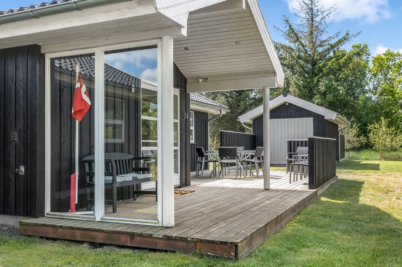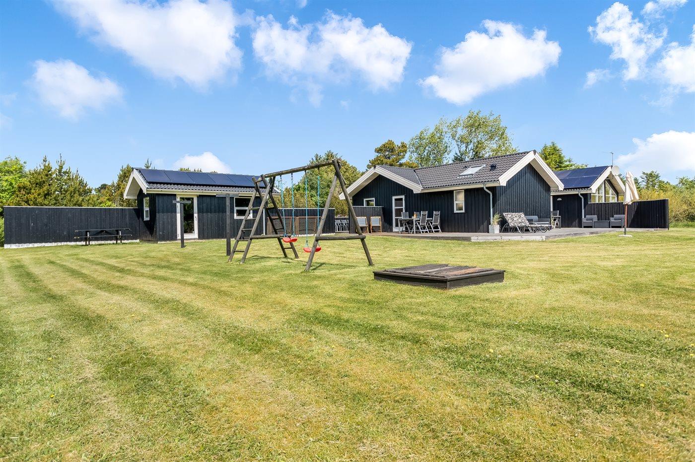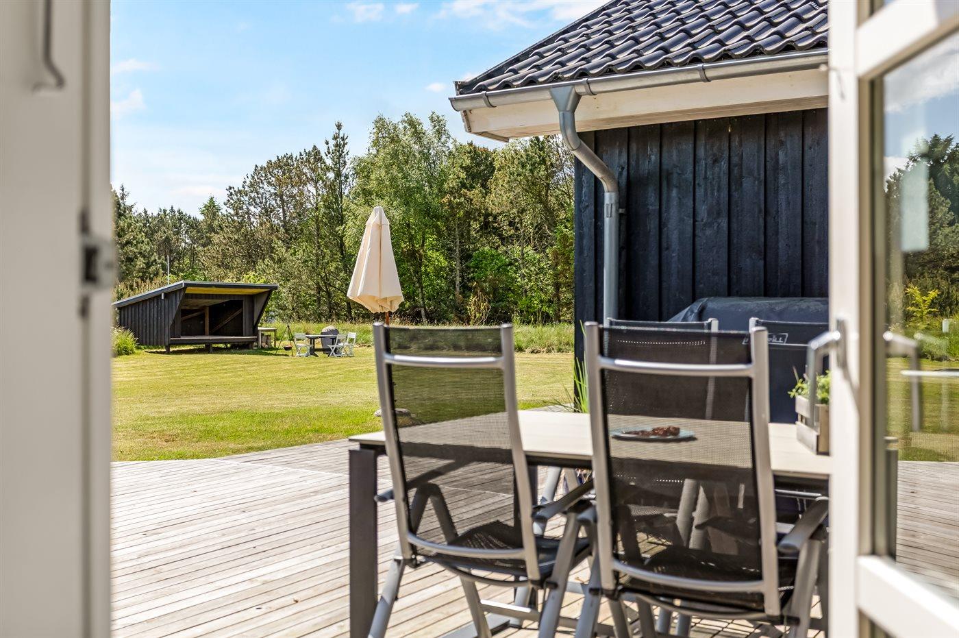 Ferieboligen er beliggende på en 2500 m² stor naturgrund. Der er 400 m til havet. Nærmeste forretning er beliggende i en afstand af 1800 m. Til ferieboligen hører åbent terrasseareal. Desuden er der overdækket terrasse. Der er redskabsrum. Gynge. Sandkasse. Legetårn. Fodboldmål. Bålsted. Shelter. Grill til rådighed. Der er installeret stik til opladning af elbil. Med 3,5 kW ladeeffekt. Parkering ved ferieboligen.