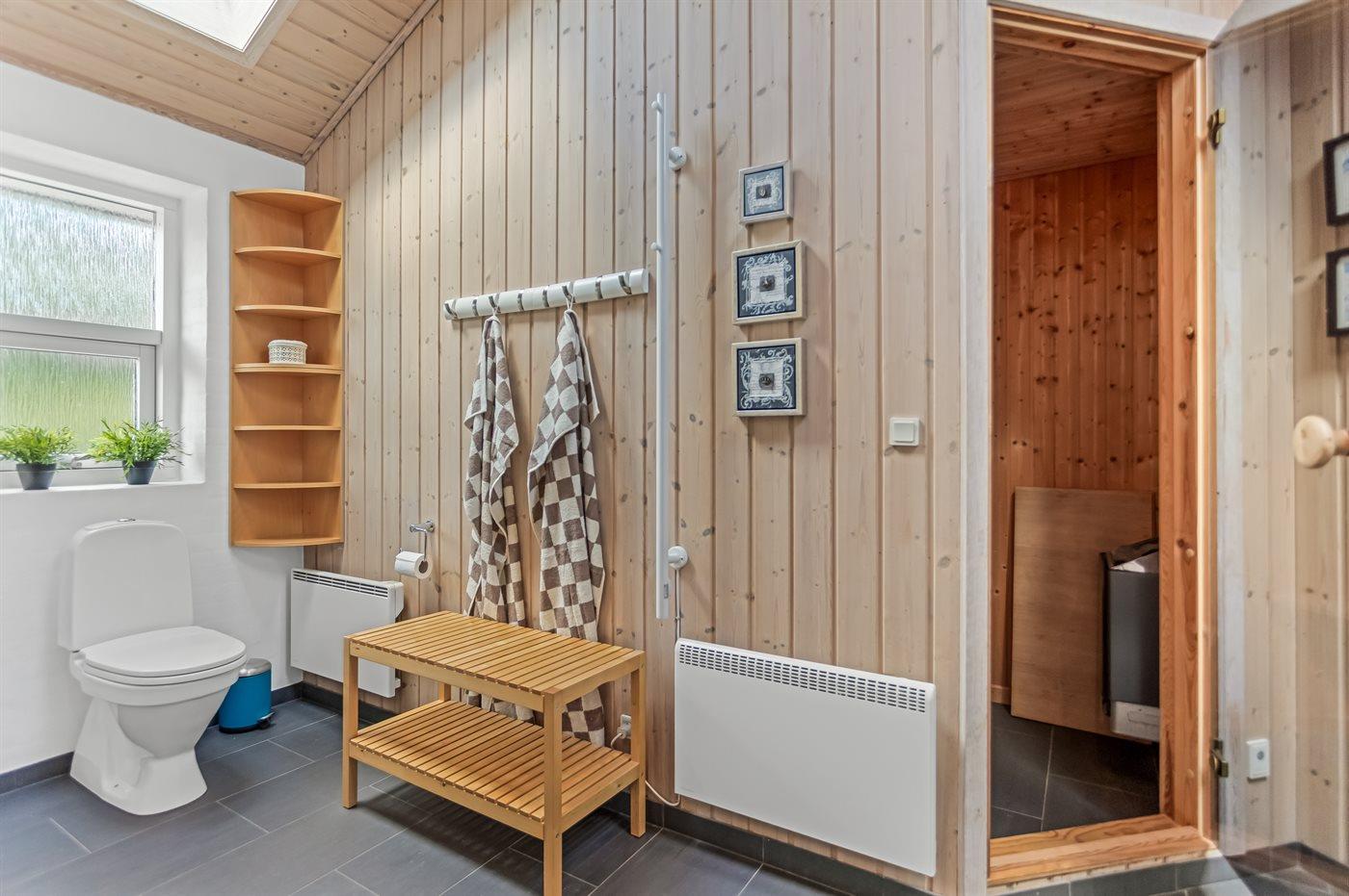 Der er 2 badeværelser med bruseniche og 2 toiletter. Der er gulvvarme på 2 badeværelser. I saunaen er der mulighed for afslapning.