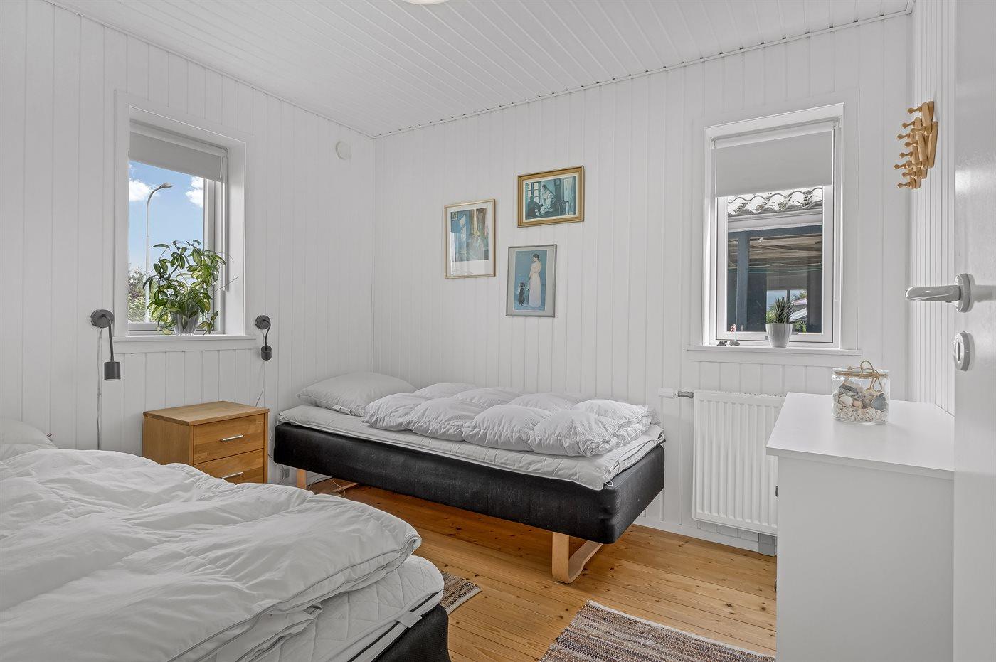 Der er i alt 2 soveværelser. Sovepladserne fordeler sig på: 2 sovepladser i dobbeltseng. 2 sovepladser i enkeltsenge. 2 sovepladser i sovesofa (dobbelt). 2 af disse sovepladser befinder sig i stuen.