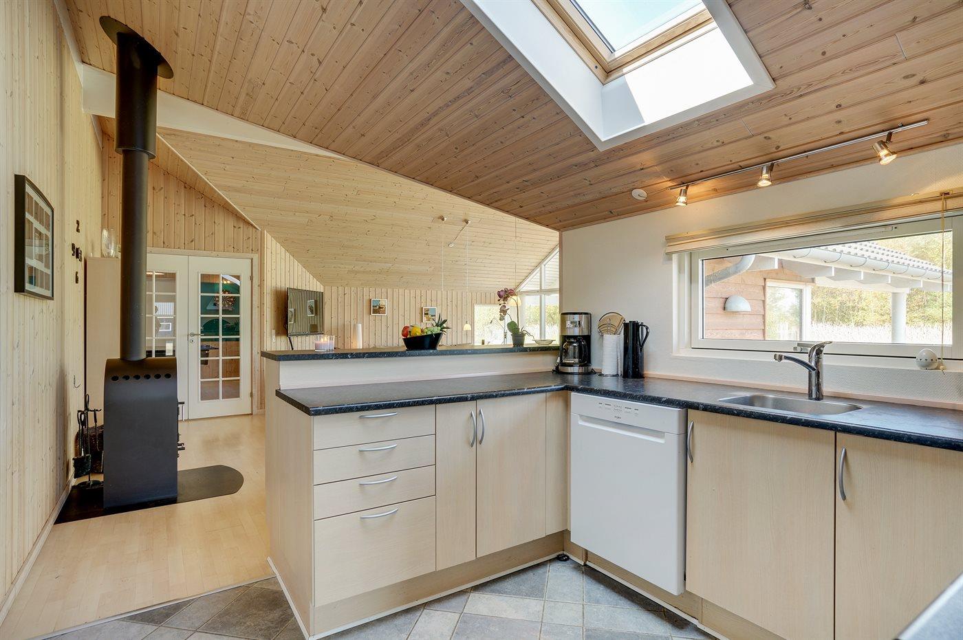 Køkkenet er udstyret med 1 køleskab. Der er 4 keramiske kogeplader, varmluftovn, mikrobølgeovn samt opvaskemaskine.