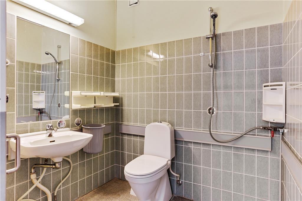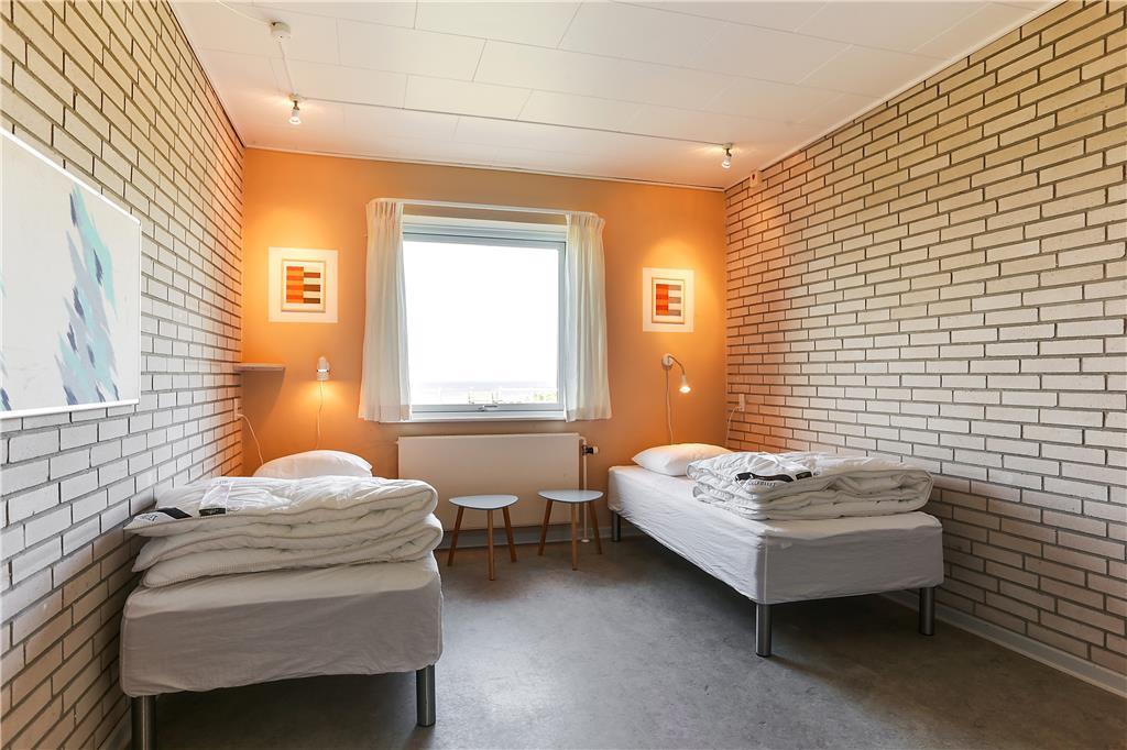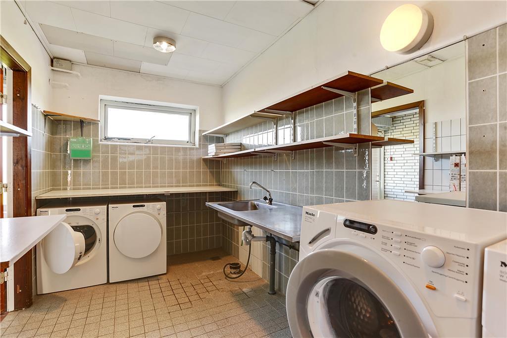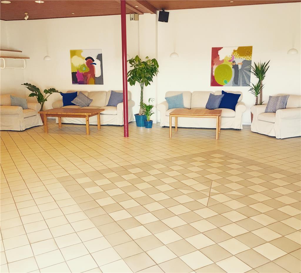 I forlængelse af spisestuen/selskabslokalet er et veludstyret industrikøkken. Her er alt hvad der skal være i et køkken og mulighed for at lave mad til hele selskabet. I køkkenet er der nedgang til kælder med køle- og fryserum, viktualierum samt fyrrum. Fra kælderen er der desuden udgang til parkeringspladsen. Der er en stor hall med reception og 4 gæstetoiletter. Der går en fordelingsgang ned i ”nord- og sydfløjen” med i alt 24 soveværelser samt 22 badeværelser. 4 af værelserne i ”sydfløjen” har direkte udgang til den udendørs swimmingpool, som kan benyttes i perioden 1/5 – 30/9. Der er derudover et vaskerum med to vaskemaskiner og to tørretumblere. Med egen indgang er der en ”krostue”, hyggeligt møbleret med billardbord, dart, TV, bar og et toilet.