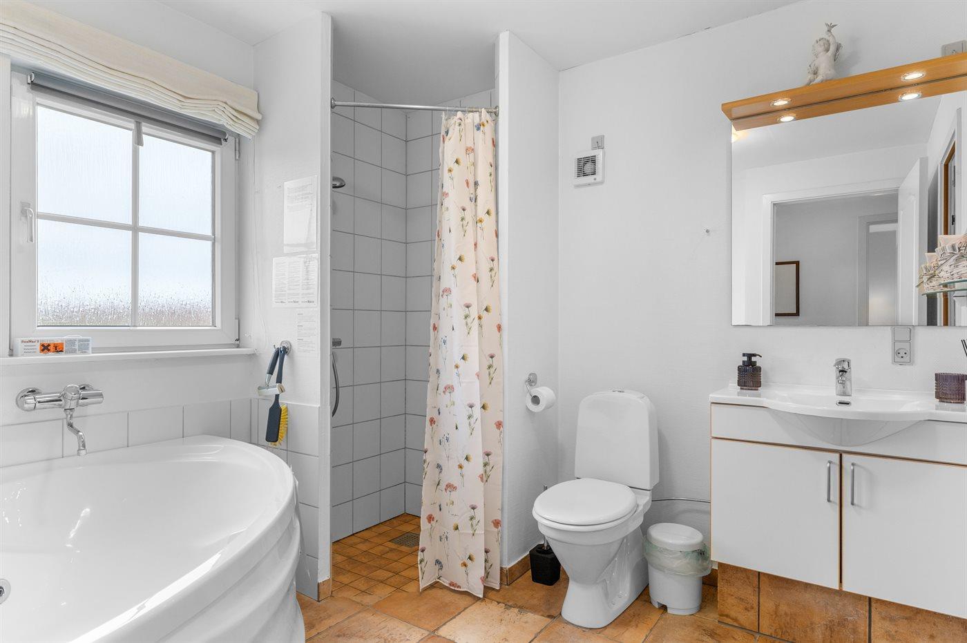 Der er 1 badeværelse med bruseniche og 2 toiletter, heraf 1 gæstetoilet. Der er gulvvarme på 1 badeværelse. I saunaen er der mulighed for afslapning.