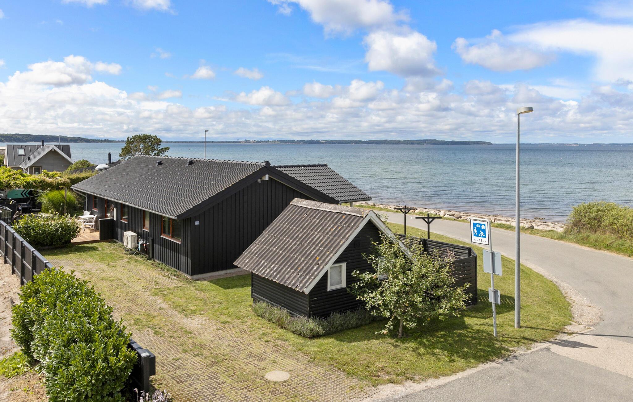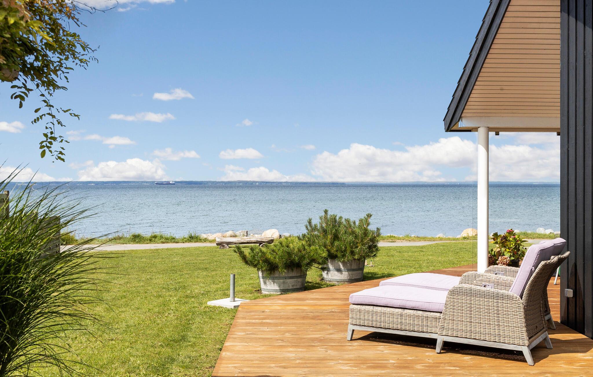 Nyd panoramaudsigt over havet fra dette moderne feriehus med åben terrasse og bålplads ved Bro Strand i Brenderup Fyn.