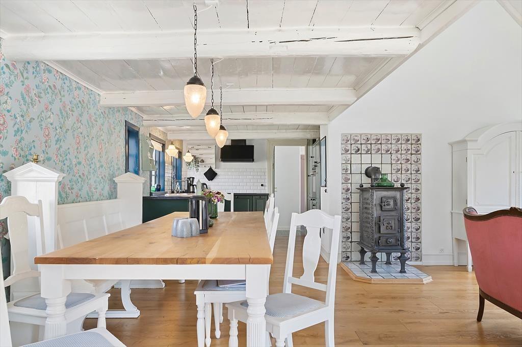Det store, åbne køkken ligger i direkte forbindelse med den hyggelige spiseplads, så madlavning og samvær smelter naturligt sammen. Her kan I nyde lange middage, hyggelige brætspilsaftener og gode samtaler – alt sammen med et skønt lysindfald fra vinduerne og havedøren. Fra spiseområdet træder I ud på en dejlig vestvendt terrasse, perfekt til solrige eftermiddage og lune sommeraftener.