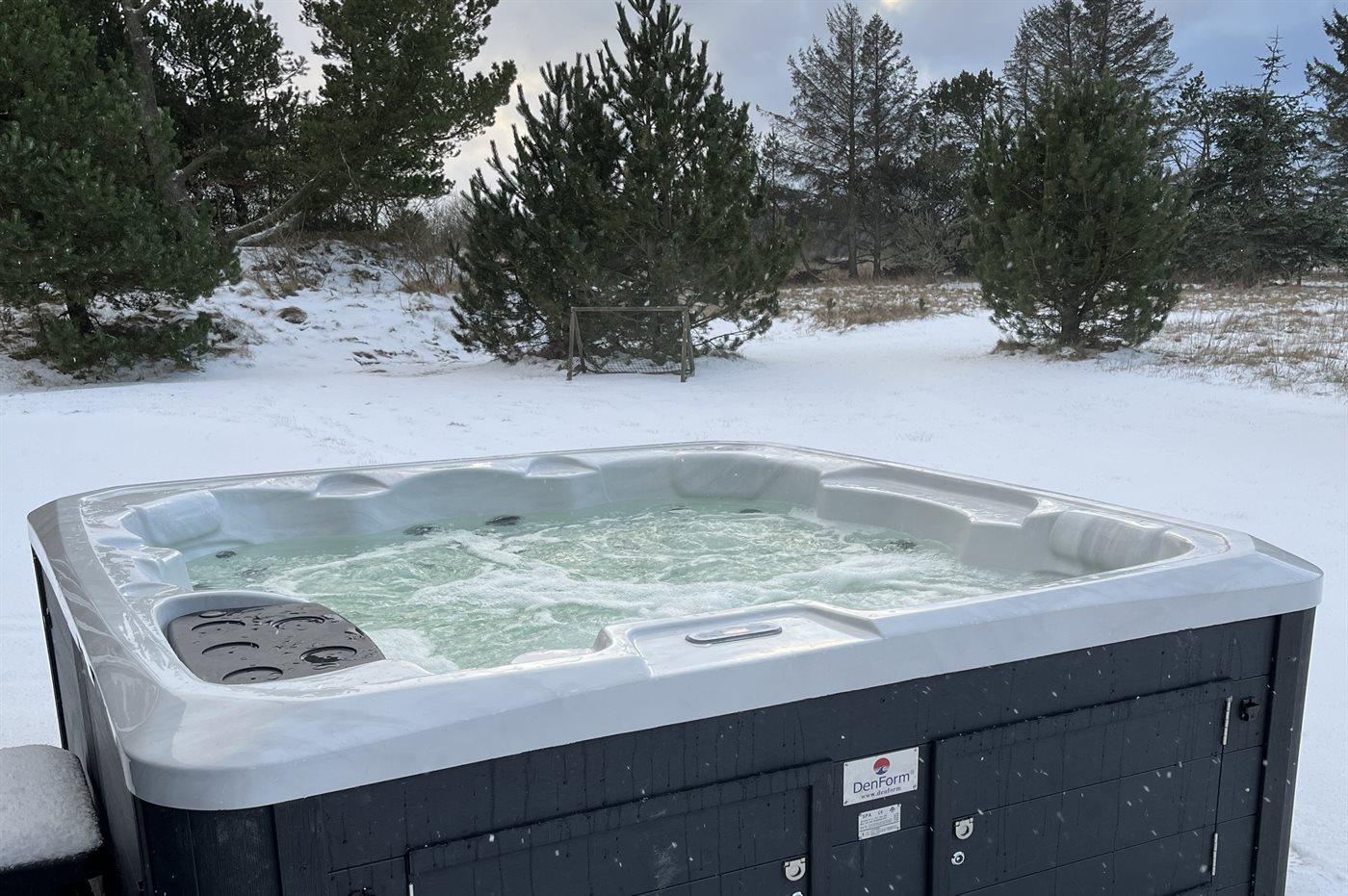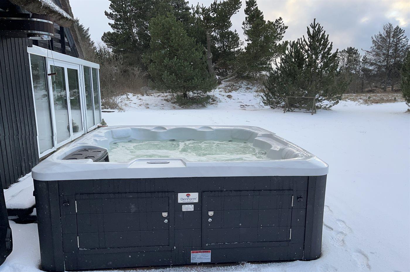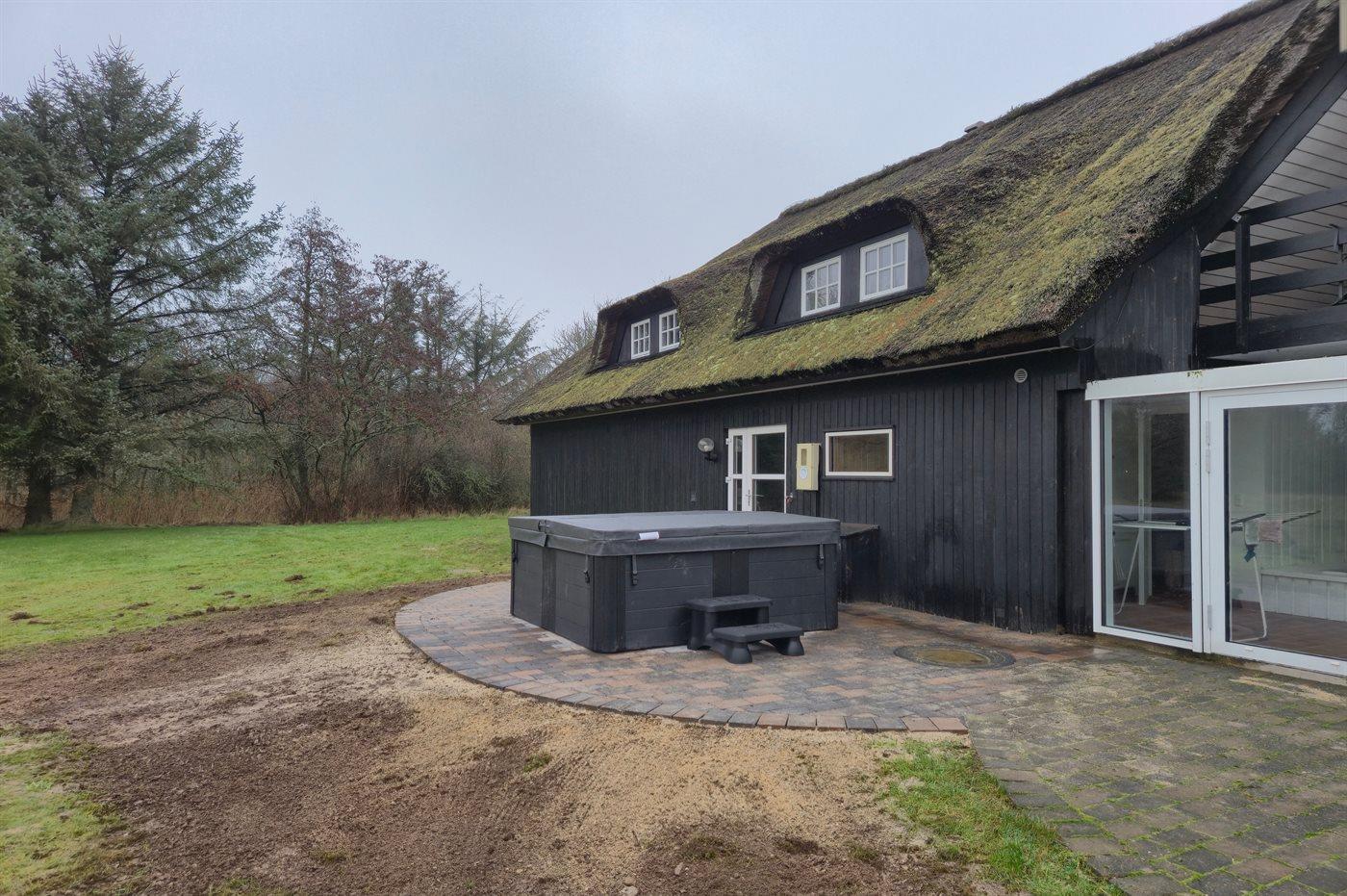 Til huset hører store, åbne såvel som overdækkede terrassearealer med havemøbler og gasgrill. Her er der også mulighed for afslapning i udendørs standvandsspa til 6 personer.