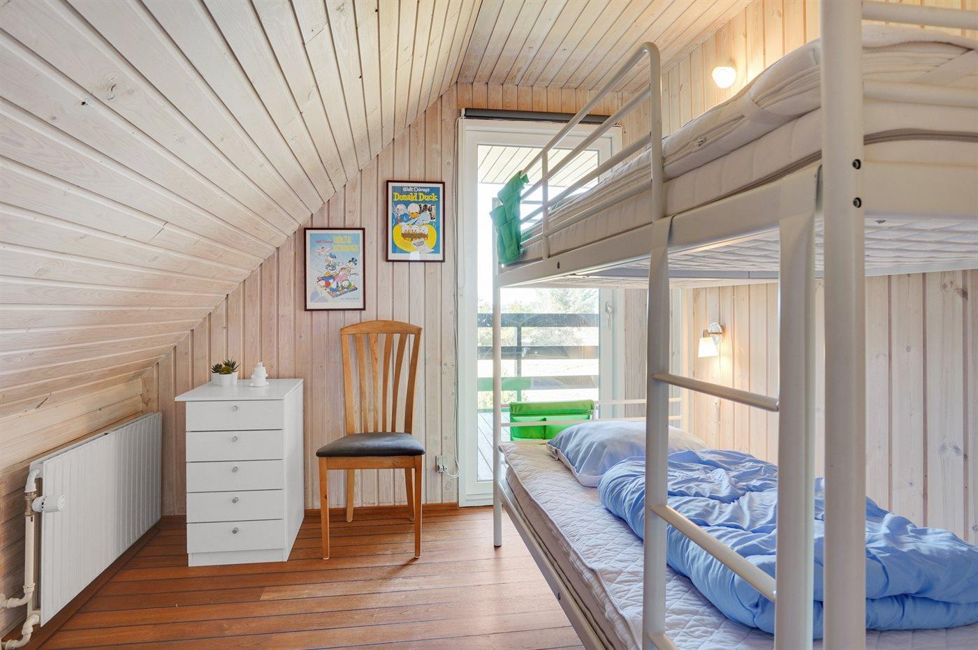 I stueplan ligger også et værelse med dobbeltseng og eget badeværelse med bruseniche. De øvrige sovepladser finder man på 1. sal. Et værelse med dobbeltseng, et værelse med dobbeltseng og dobbeltsovesofa, et stort master-bedroom med dobbeltseng og sovesofa, et værelse med køjesenge og enkeltseng samt et værelse med to enkeltsenge. De 4 af værelserne har adgang til store overdækkede altaner med udsigt over haven.
