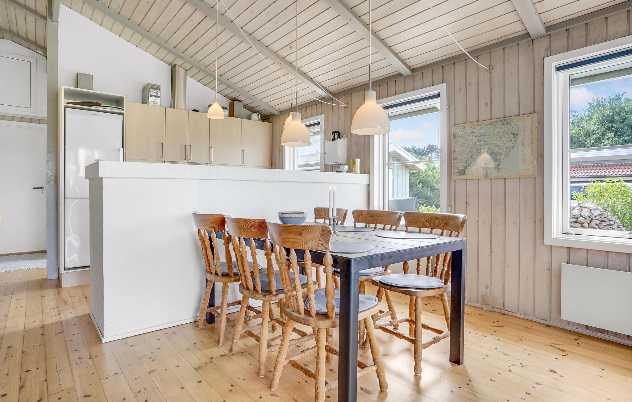 Det dejlige hus har en smuk udsigt til de grønne omgivelser og er inddelt i fire soveværelser, et badeværelse, en opholdsstue med køkken og et separat toilet. Opholdsstuen med åbent køkken, sofa og spiseplads danner centrum af huset. Tilbring hyggelige aftener med ild i brændeovnen eller hyggelige måltider ved spisebordet.