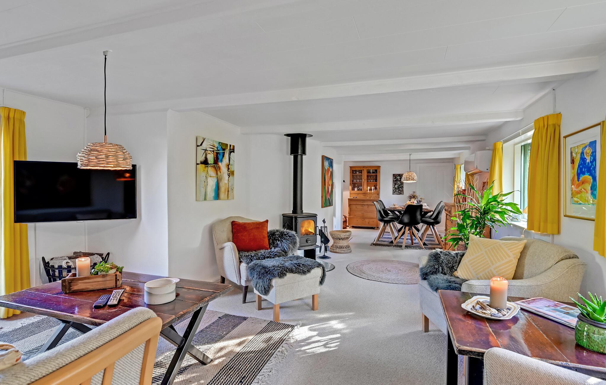 Tilbring en dejlig ferie i dette indbydende sommerhus, der er komfortabelt indrettet og skaber ideelle rammer for et ophold, som I vil huske med glæde i lang tid. En smuk udsigt over fjorden fuldender feriestemningen. Der er behagelig gulvvarme i badeværelset. Om aftenen kan I slappe af ved brændeovnen og lytte til flammens knitren.
