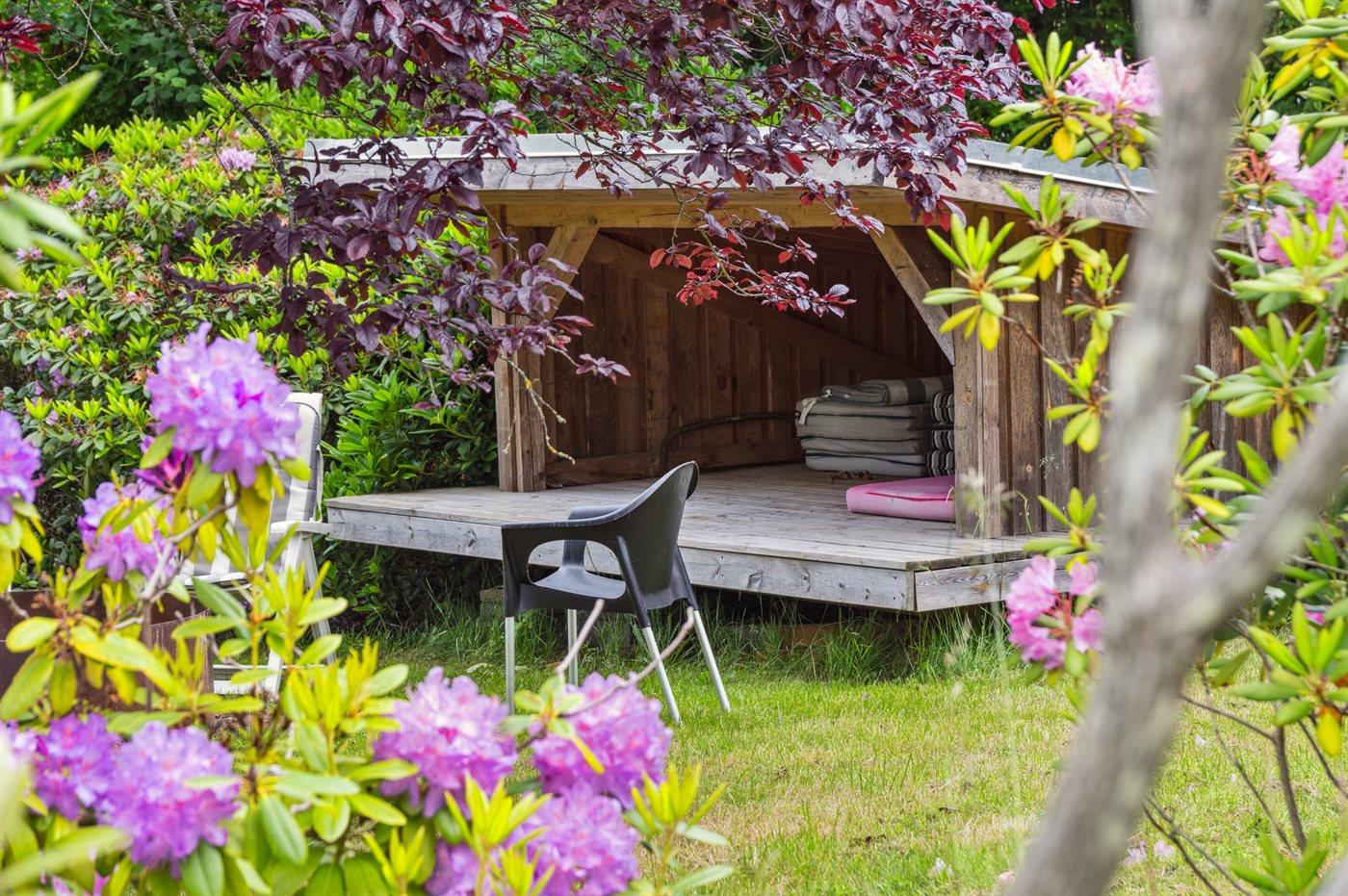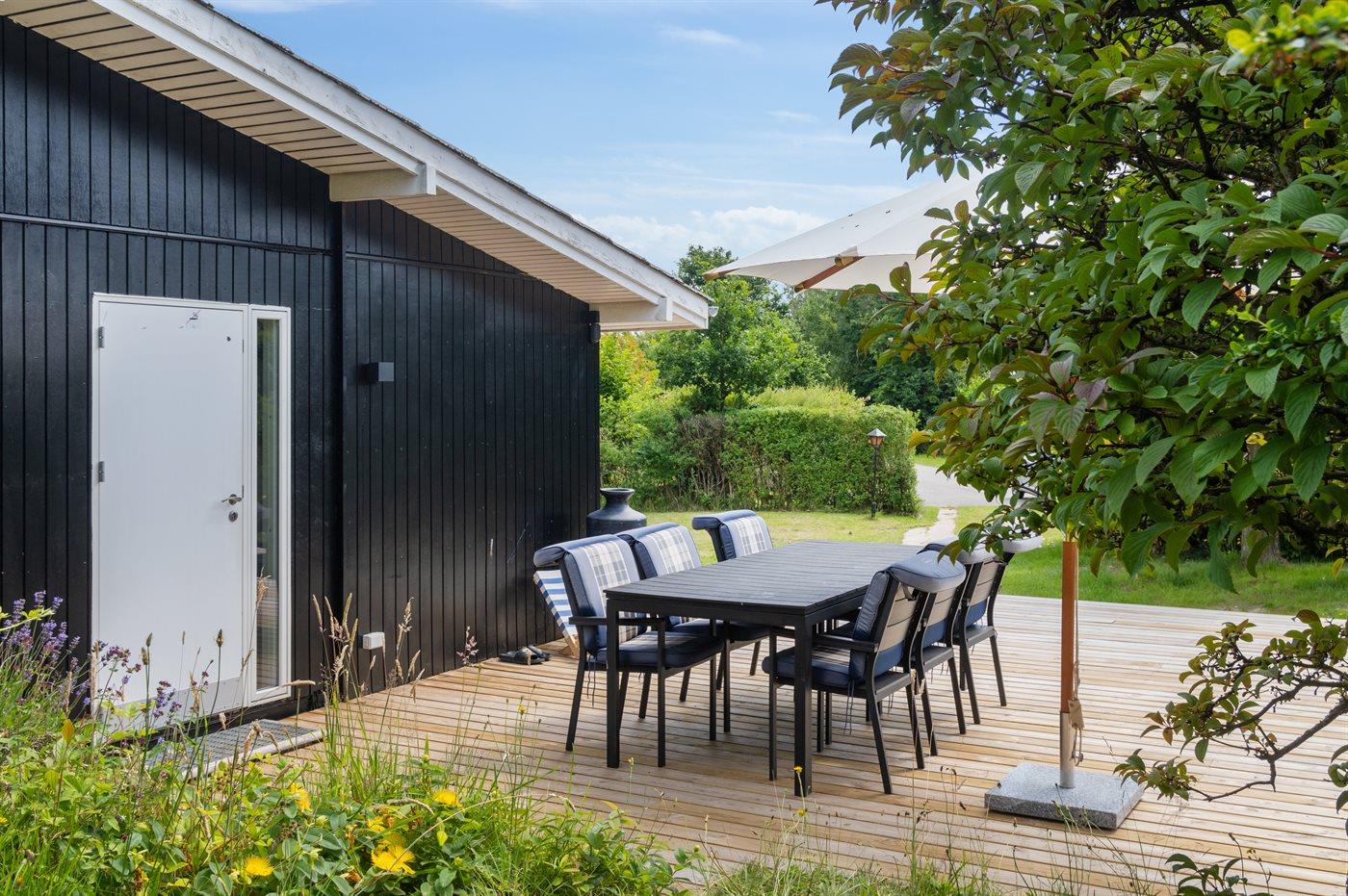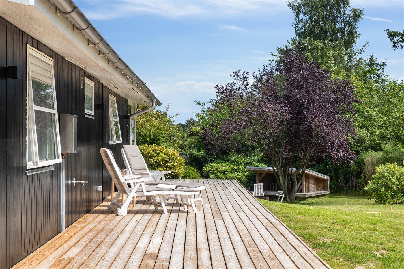Ferieboligen er beliggende på en 1200 m² stor havegrund. Der er 600 m til havet. Nærmeste forretning er beliggende i en afstand af 2100 m. Til ferieboligen hører åbent terrasseareal. Desuden er der overdækket terrasse. Bålsted. Shelter. Grill til rådighed. Der er installeret stik til opladning af elbil. Type 2 stik. Med 11 kW ladeeffekt. Parkering ved ferieboligen.